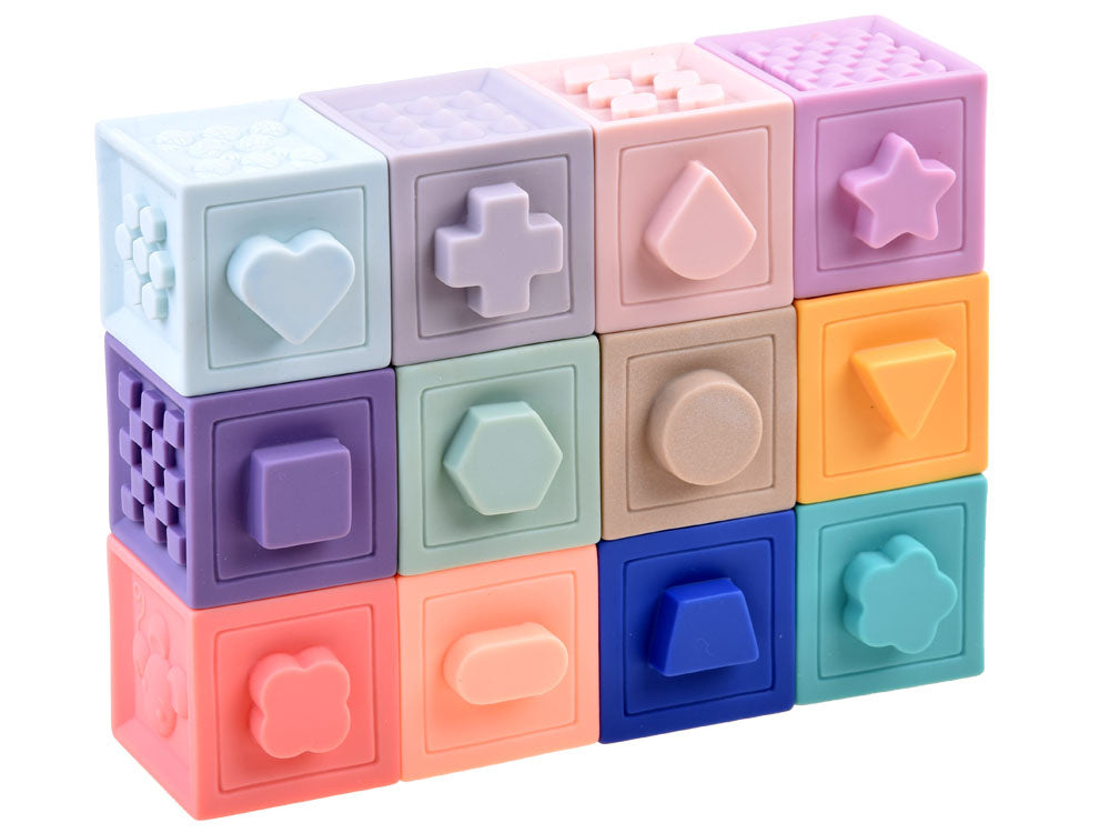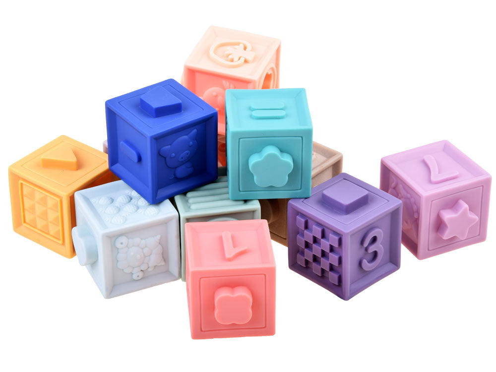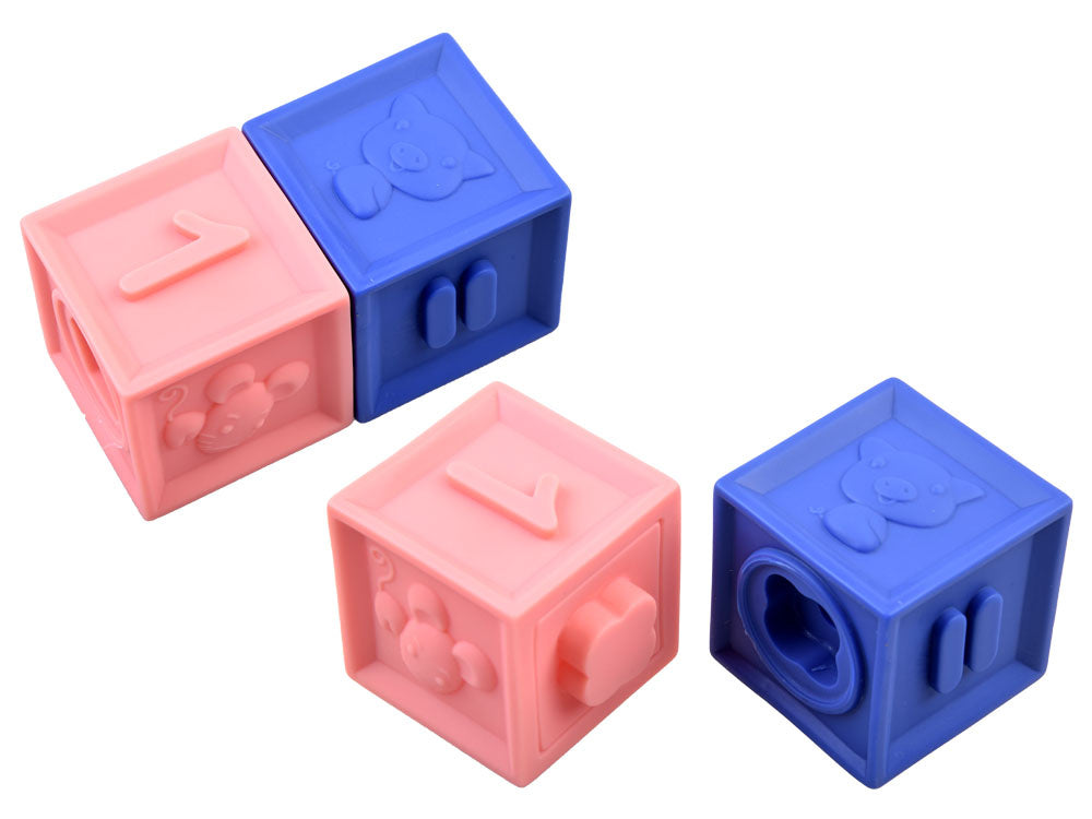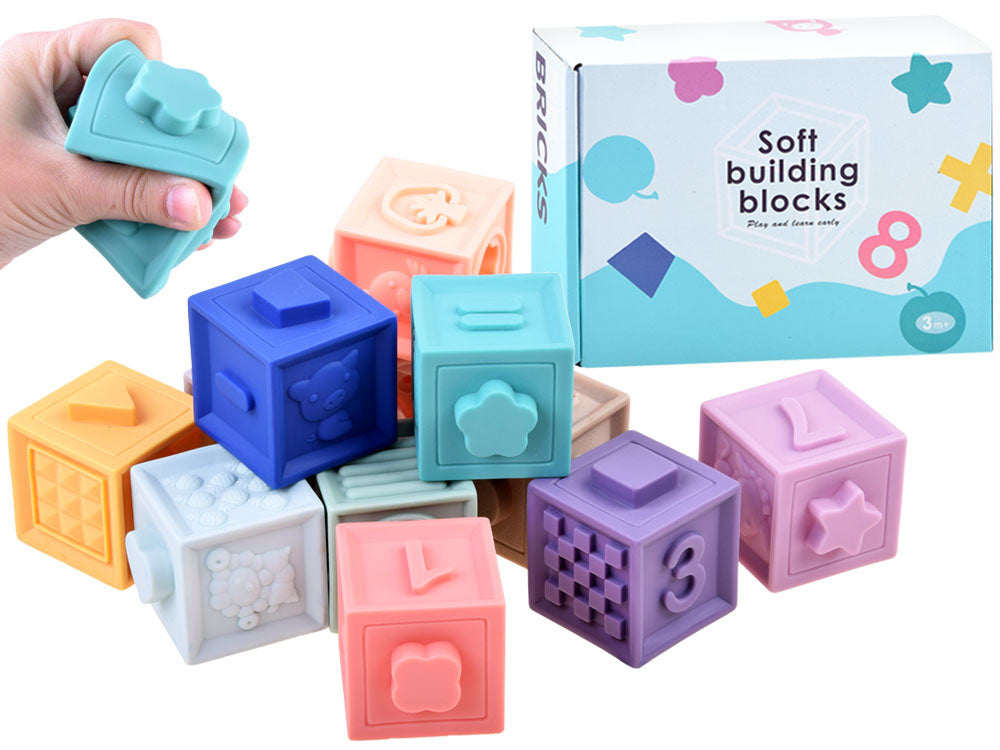 Minkšti sensoriniai kubeliai kūdikiams. Pagaminta iš minkštos guminės medžiagos, kuri užtikrina patogų ir saugų žaidimą. Kaladėlės yra išgaubtų formų, kurių dėka mažylis galės lengvai jas priderinti vienas prie kito. Kiekvienas blokelis turi skirtingas formas, gyvūnai ir skaičiai. Dėl savo struktūros jie puikiai veiks ir kaip kramtukai kūdikiams.