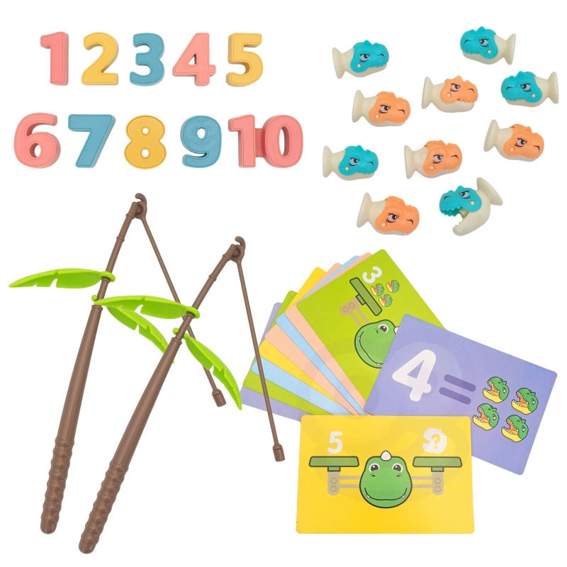 WOOPIE prekės ženklo mokomasis rinkinys skatins mokytis pasaulio, skaičių ir matematinių veiklų, o pertraukėlę tarp mokymosi galėsite padaryti su dinozaurų žvejybos žaidimu! Ant stovo pastatytas didelis dinozauras, kad galėtume žaisti su pusiausvyra. Už dinozauro yra vietos meškerėms, o prie jų galima pritvirtinti rinkinyje esančius lapus. Šis žaislas puikiai lavina vaizduotę, skatina kūrybinį ir nestandartinį mąstymą, nuostabiai lavina mažųjų rankų darbo įgūdžius, be to, mokymosi metu suteikia daug džiaugsmo.