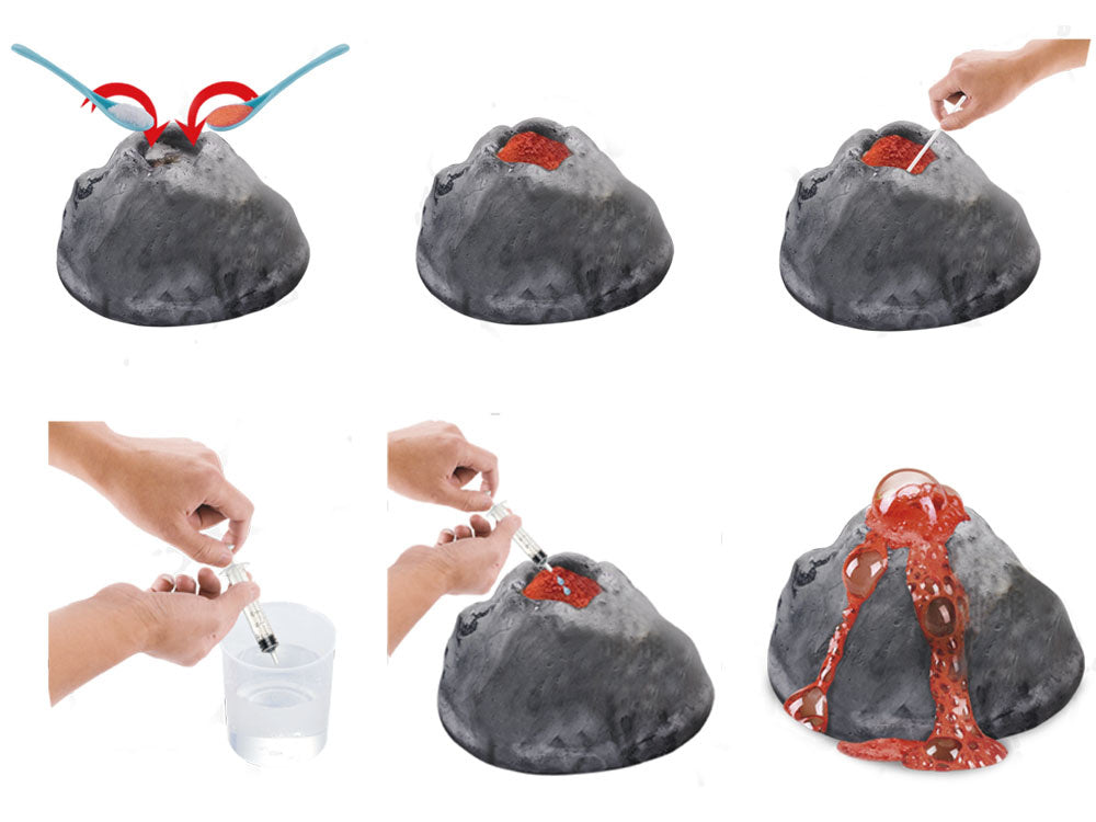 2. Į puodelį įpilkite vandens ir juo užpildykite švirkštą. Tada švirkštu į ugnikalnio kraterį įpilkite vandens. Darykite tai atsargiai, kad rankos neliestų ugnikalnio liejinio.
