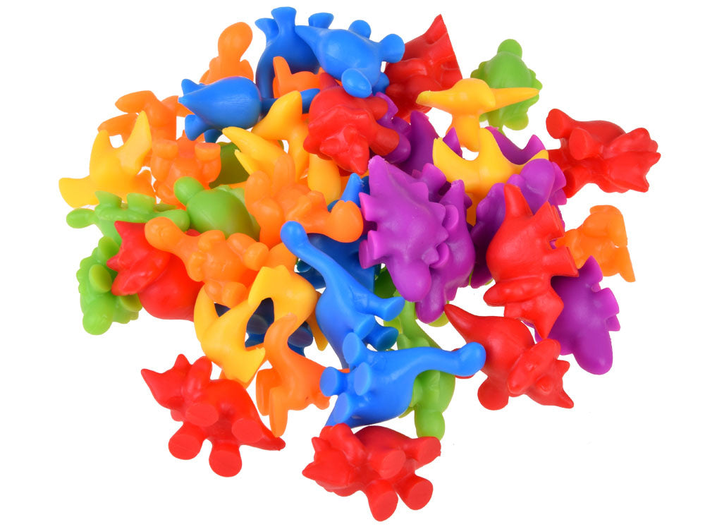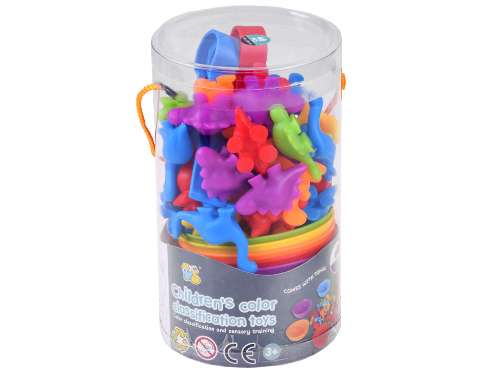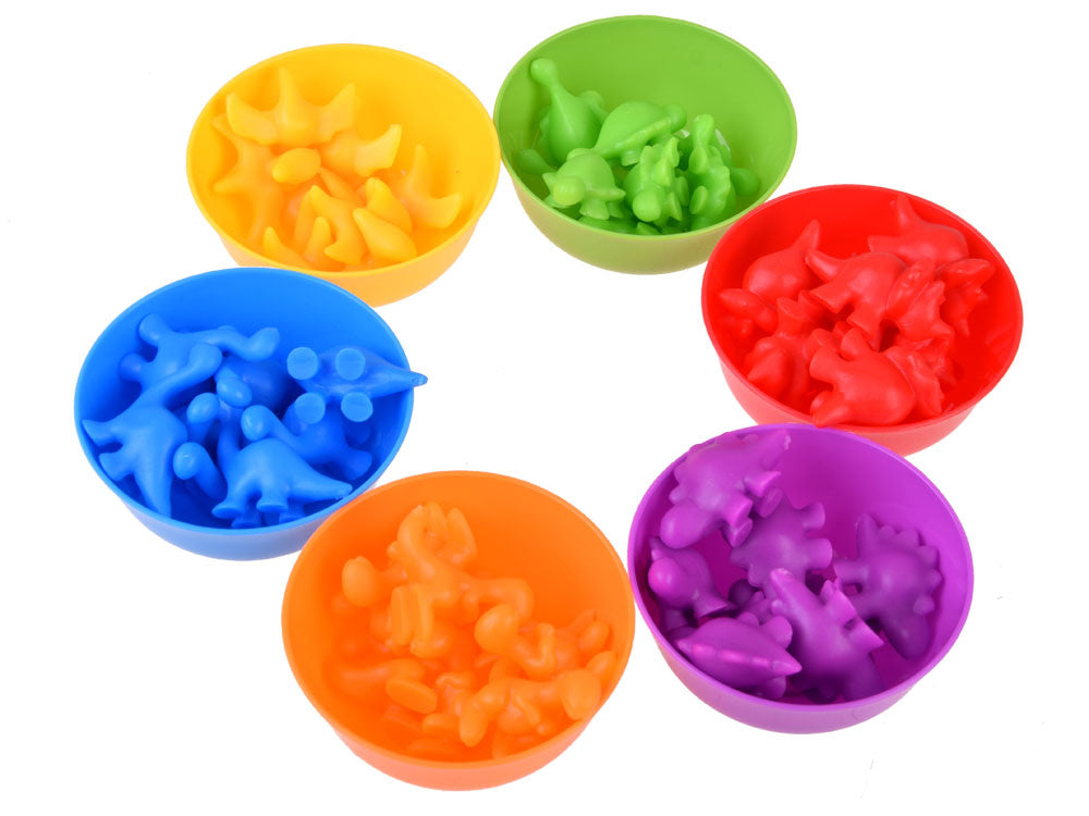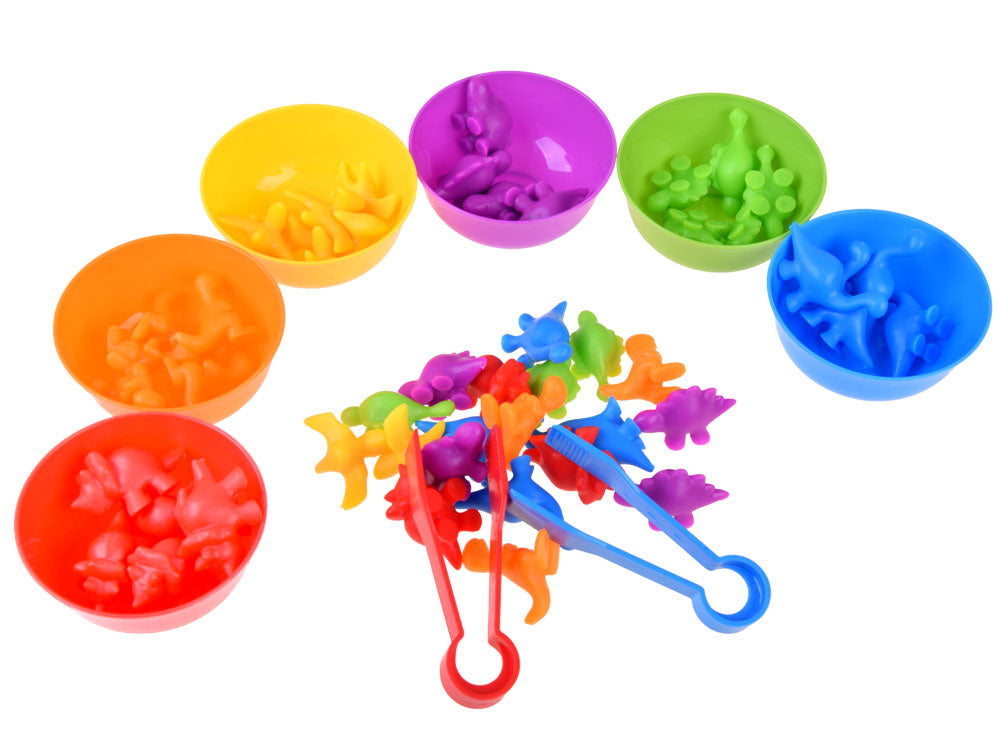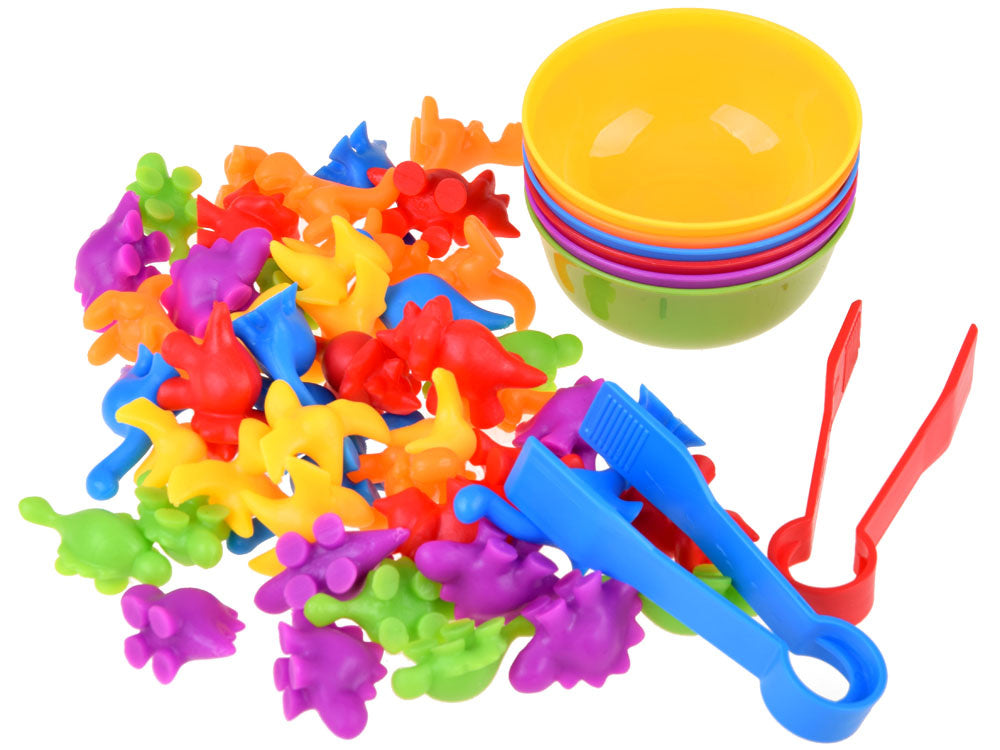 Išbarstykite visus dinozaurus ir sumaišykite, išdėliokite dubenėlius. Vaiko užduotis - pincetu surūšiuoti dinozaurus ir į atitinkamą dubenėlį sudėti tinkamos spalvos dinozaurus. Jis taip pat gali juos skirstyti pagal formas ir atlikti įvairius skaičiavimo veiksmus. Tai puikus mokymasis skaičiuoti, sudėti ir atimti bus paprasta ir smagu. Rinkinys su dinozaurų figūrėlėmis yra puikus būdas mokytis skaičiuoti ir pažinti spalvas.