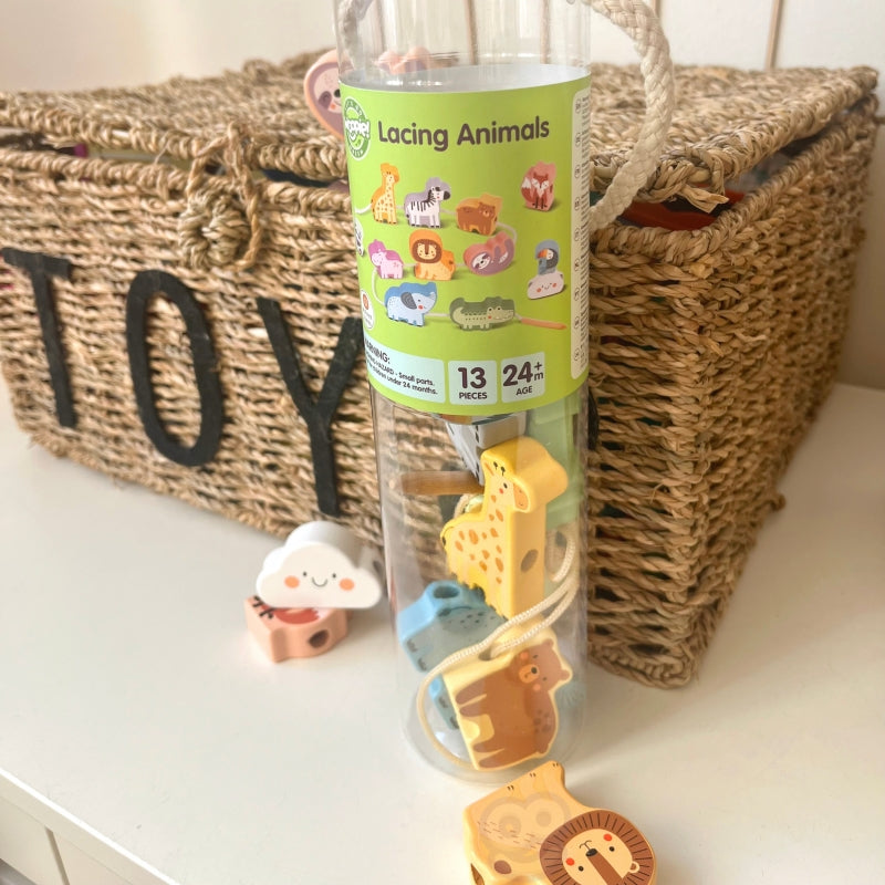 WOOPIE GREEN „Zoo Animal Threadading Blocks“ yra puikus žaislas, padedantis lavinti vaikų smulkiąją motoriką. Rinkinį sudaro kruopščiai pagaminti mediniai gyvūnai: meškiukas, liūtas, krokodilas, žirafa, tinginys, hipopotamas, dramblys, panda, tukanas ir lapė. Kiekvienas gyvūnas turi specialias skylutes, pro kurias vaikas gali siūti spalvotas virveles. Mažiausiems skirtas klasikinis medinių detalių rinkinys su skylutėmis, pro kurias vaikas gali siūti virvelę. Šis žavus žaidimas ne tik lavina mažųjų rankų miklumą, bet ir skatina vaiko smalsumą apie gyvūnus ir supantį pasaulį.