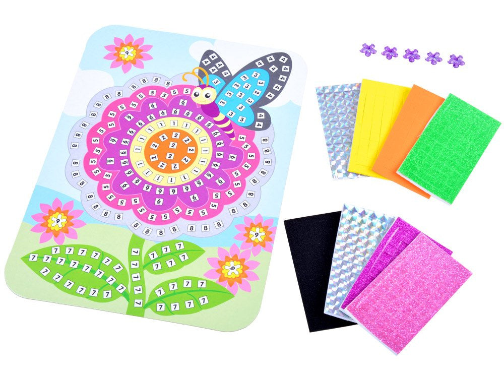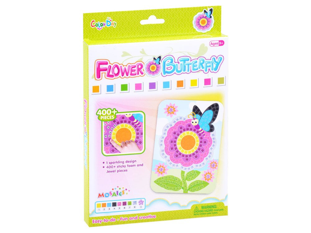 Gėlės ir drugeliu mozaika - tai kūrybinis rinkinys vaikams, mėgstantiems meną. Puikiai lavina vaiko meninius gebėjimus, suteikia daug džiaugsmo ir smagumo. Žaislas lavina rankų ir akių koordinaciją, smulkiąją motoriką, taip pat skatina kūrybinį mąstymą. Toks paveikslas taip pat gali būti nuostabus atvirukas mamai, tėčiui, močiutei, seneliui.
