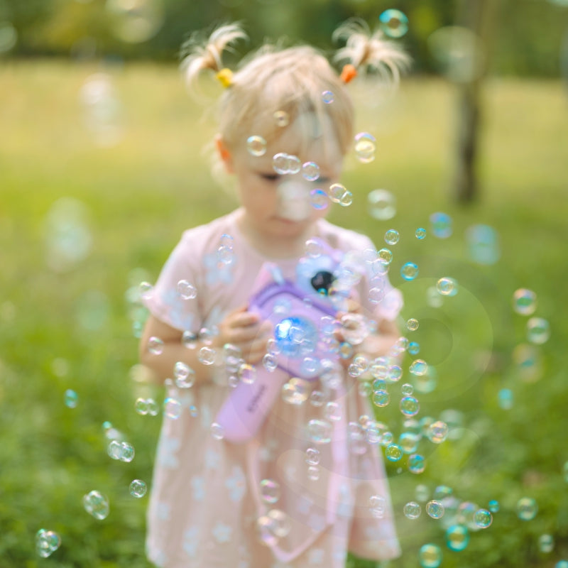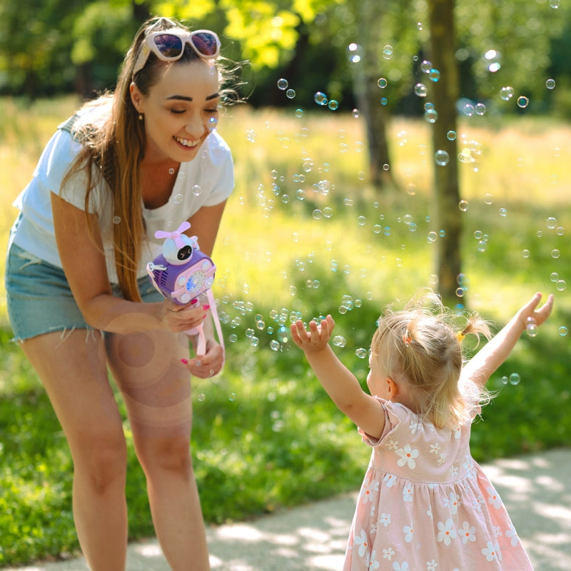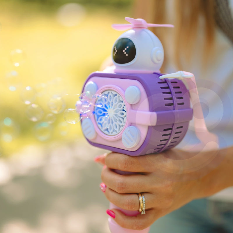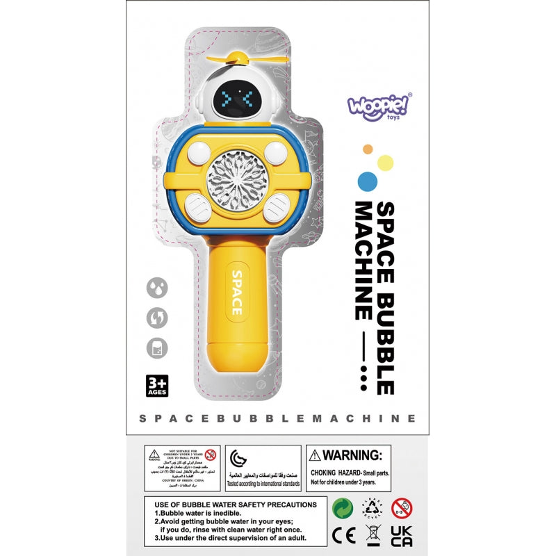 WOOPIE astronauto formos burbulų mašina yra puikus žaislas vaikams. Išleidžiami burbulai ne tik šaudo dideliu dažniu, bet papildomai įmontuotas ventiliatorius juos pučia dar toliau. Žaislą galima įjungti paspaudus mygtuką ir mašina automatiškai paleis burbulus. Žaislas turi dirželį, kurį vaikas gali pasikabinti ant kaklo, vaikščioti ir leisti burbulus nespausdamas jokio mygtuko.