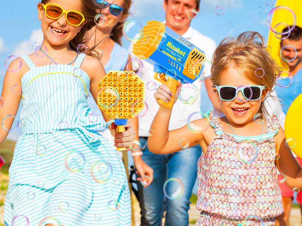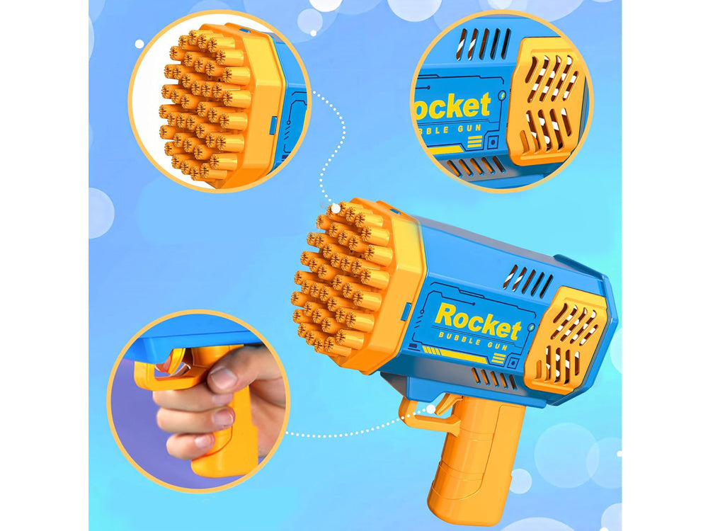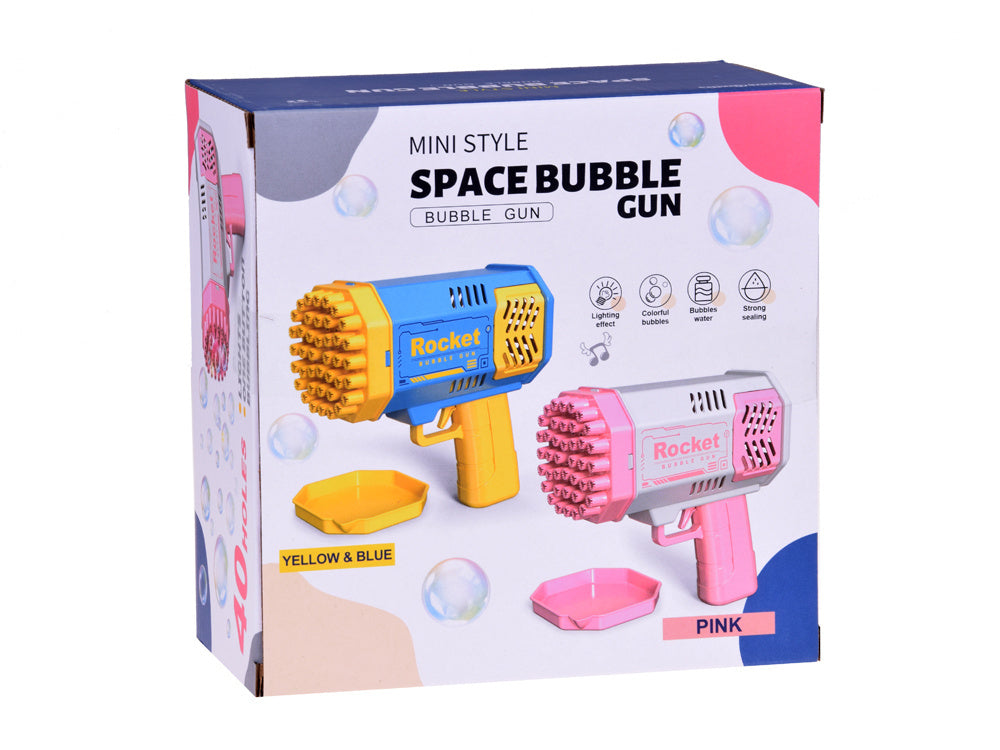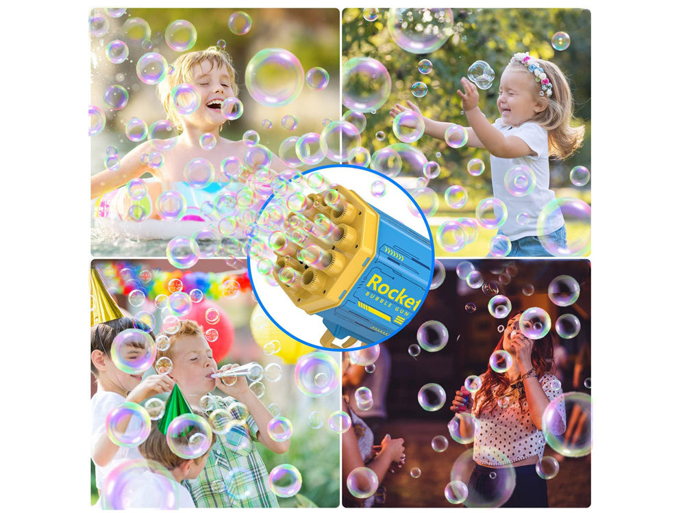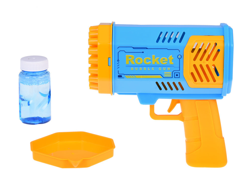 Mėlynos ir geltonos spalvos muilo burbulų pistoletas yra puikus žaislas, iš kurio vienu metu galima išleisti iki 40 spalvingų, žvilgančių muilo burbulų! Tai labai smagu - ne tik naudotojui, bet ir visiems, kurie gali stebėti šį reiškinį. Leiskite sau ir savo artimiesiems šiek tiek nusišypsoti! Būtent tai tikrai gausite su šia smagia veikla! Mašinėlę galima žaisti ir su draugais, ir su šeima.