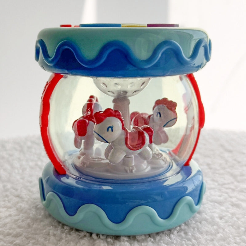 WOOPIE muzikinis būgnelis su šviesomis yra žaislas, kurio reikia kiekvienam vaikui. Žaislas daugiausia skirtas pojūčiams lavinti. Žaislas taip pat veikia kaip muzikinė dėžutė su viduje besisukančiais arkliukais. Grojant melodijai žybsi lemputės. Naktį žaislas veikia kaip projektorius - švieselės šviečia ir imituoja žvaigždes.