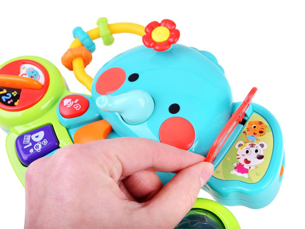 - galima pasukti dramblio liemenį ir taip įjungti garso efektą
