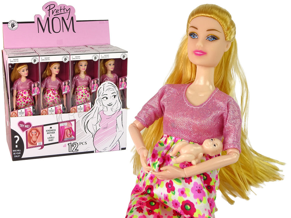 Nėščia lėlė su kūdikiu gėlėta suknele