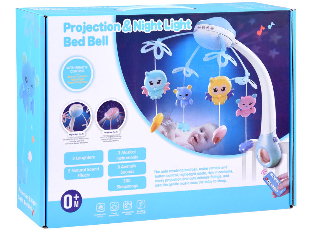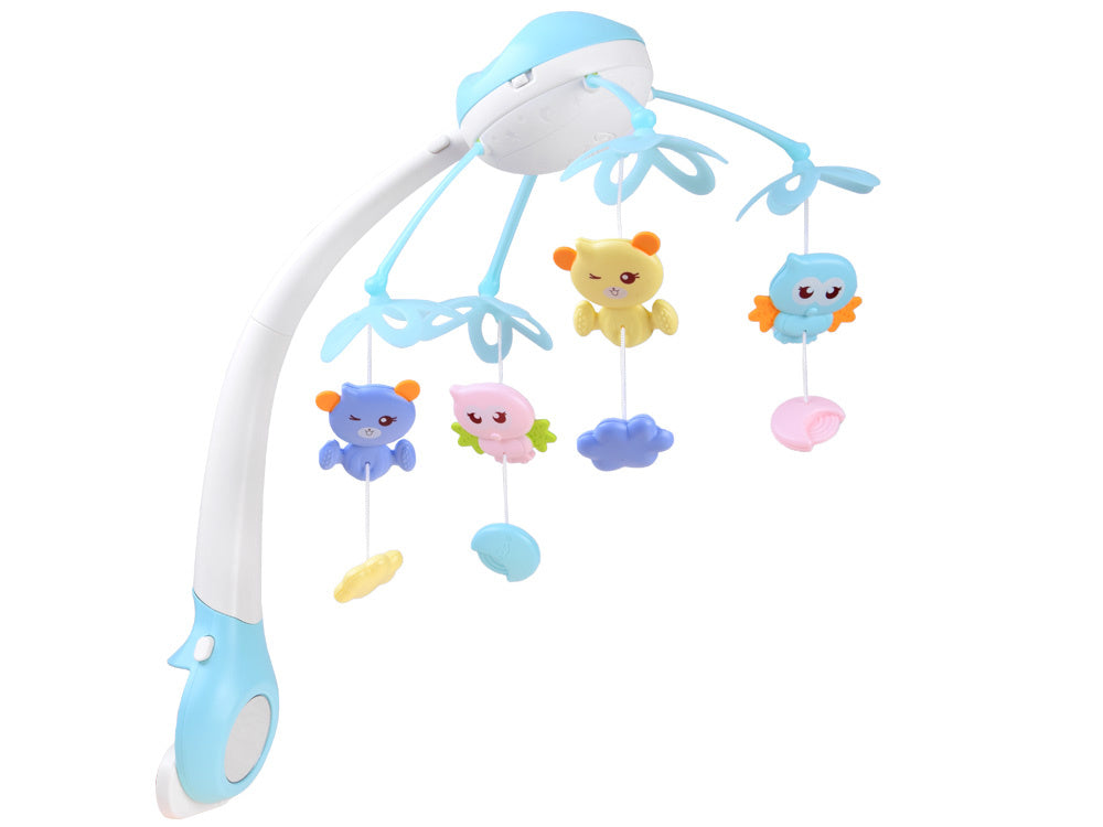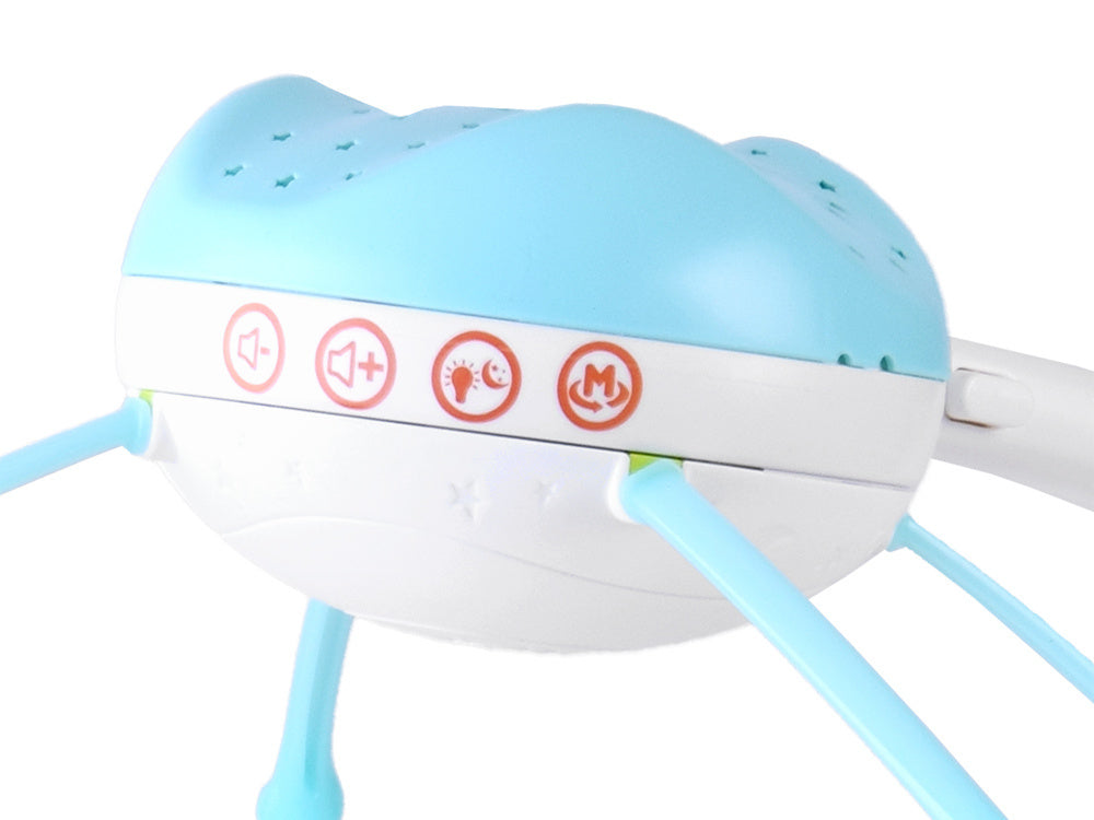Nuotoliniu būdu valdoma vaikiškos lovytės karuselė su garso ir šviesos efektais, mėlyna