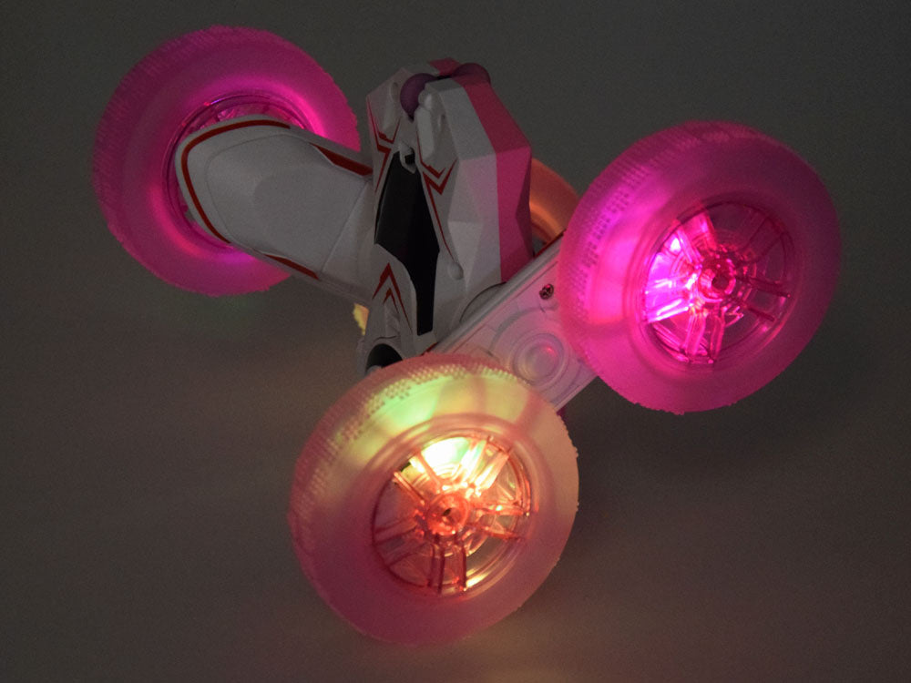 360 laipsnių kampu nuotoliniu būdu valdomas automobilis idealiai tinkantis mažiesiems automobilių sporto ir beprotiškų kaskadinių triukų gerbėjams. Jo naujoviška konstrukcija leidžia apsisukti visu 360° kampu, o tai reiškia, kad apverstas į kitą pusę automobilis ir toliau važiuoja. Transporto priemonės šviečiantys ratai, nuostabiai šviečia žaidžiant sutemus arba tamsiame kambaryje. Suplanuokite naktinį pasivažinėjimą su mūsų pašėlusiu kaskadininkų automobiliu „Stunt Car 360°“!