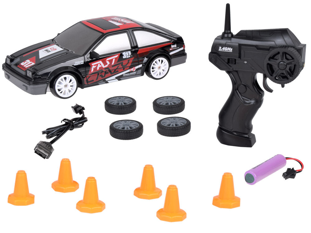 Šis nuotoliniu būdu valdomas lenktyninis automobilis su atsarginių ratų komplektu pradžiugins kiekvieną automobilių ir lenktynių gerbėją. Automobilis valdomas 2,4 GHz nuotolinio valdymo pulteliu su įmontuota antena, leidžiančia visiškai valdyti transporto priemonę: važiuoti pirmyn, atgal, sukti į dešinę ir į kairę. Pridedami papildomi atsarginiai ratai ir kūgių rinkinys, kad būtų galima sukurti nuostabias lenktynių trasas lenktynėms ar driftui.
