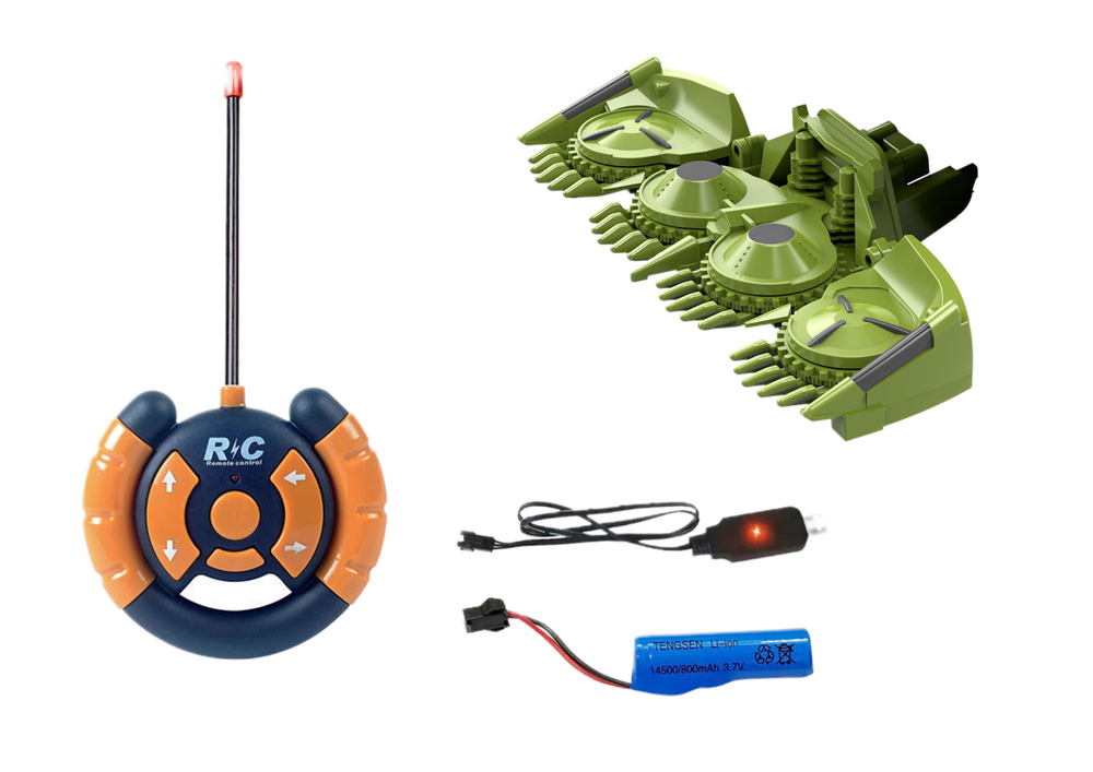 Nuotoliniu būdu valdomas kombainas su priekaba, žalias