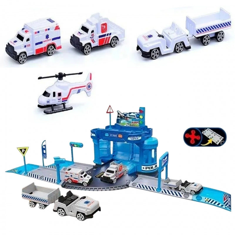 Šis teminis rinkinys iš Woopie puikiai tinka mažiesiems transporto priemonių, lėktuvų ir policijos žaidimų gerbėjams! Vietoj klasikinės daugiaaukštės automobilių stovėjimo aikštelės, šiame rinkinyje yra oro uosto policijos stotis su transporto priemonėmis, sraigtasparniu ir dideliu išskleidžiamu kilimėliu su kilimo tako atspaudu. Gausus priedų rinkinys ir įvairios transporto priemonės užtikrins valandų valandas kūrybinio malonumo ir ugdys vaiko vaizduotę.