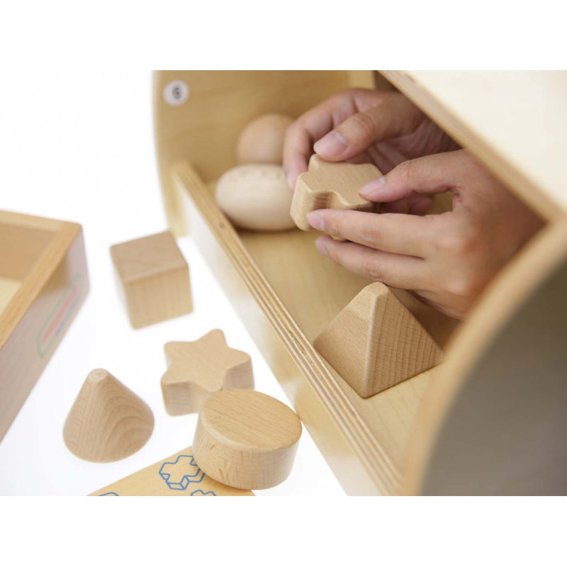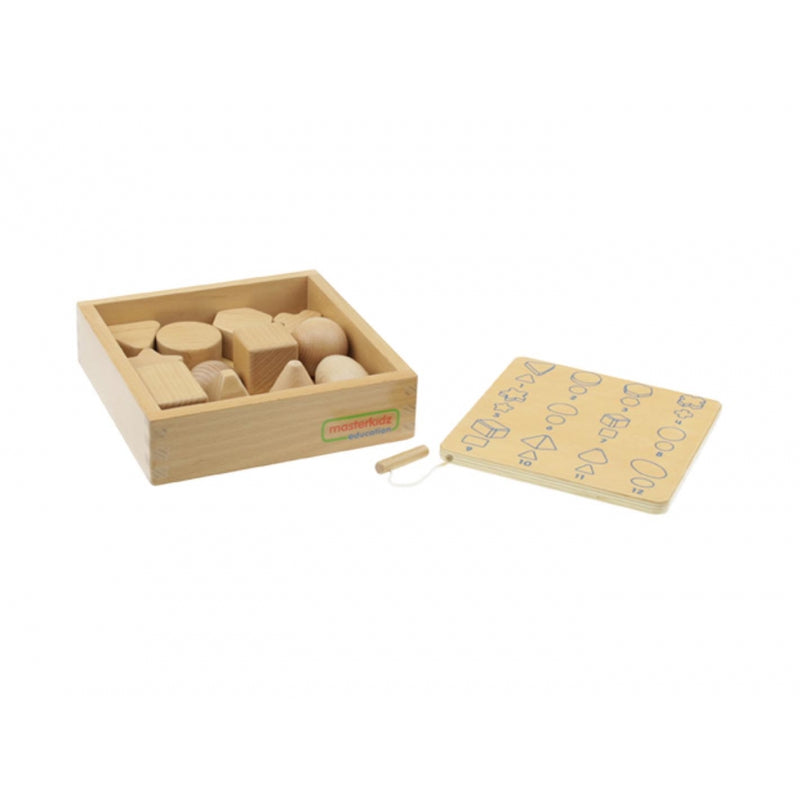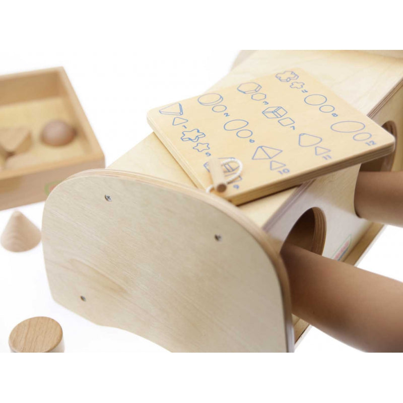 12 medinių Paliesk ir atspėk žaidimų elementų rinkinyje yra įvairių formų kaladėlių. Iš pradžių vaikui gali kilti sunkumu juos atspėjant, tačiau kiekvieną kartą vaikas tobulės ir mankštinsis.