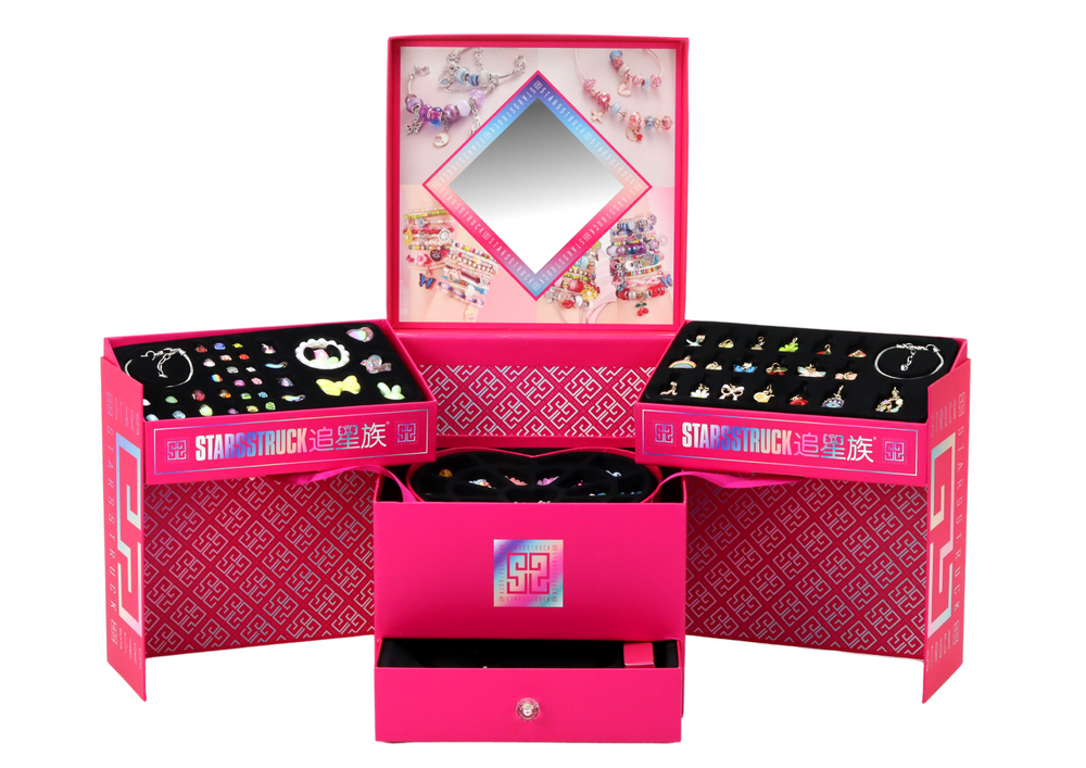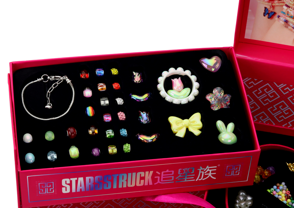 Nepaprastas karoliukų rinkinys, kuris nukels jūsų vaiką į nesibaigiančių linksmybių ir kūrybiškumo pasaulį. Šis unikalus rinkinys, supakuotas didelėje kvadratinėje rožinėje dėžutėje, kuri pradžiugins kiekvieną mažąjį menininką. Atidarius dėžutę, dėžutės sienelės atsidaro ir atsiveria trys didelės lentynos, kurių kiekviena pripildyta spalvingų papuošalų kūrimo lobių.