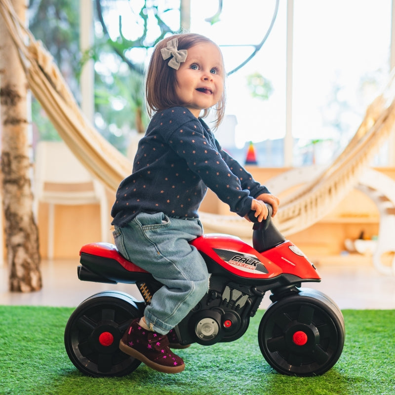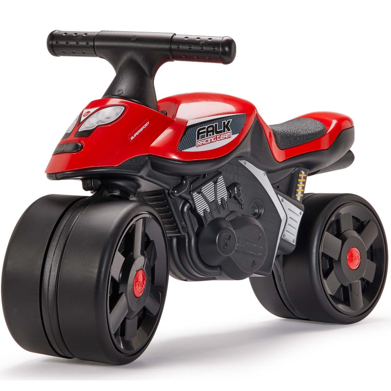 Prancūzų važinėjimo priemonių gamintojo „Falk“ lenktyninis motociklas yra puiki dovana vaikui. Graži grafika ir labai tikroviškas dizainas suteiks daug džiaugsmo mažiesiems. Važinėjimo motociklas turi didelius ratus, kurie puikiai tinka važiuoti įvairiais paviršiais. Priekinis ratas yra pasukamas, kad būtų patogiau vairuoti ir sukti.
