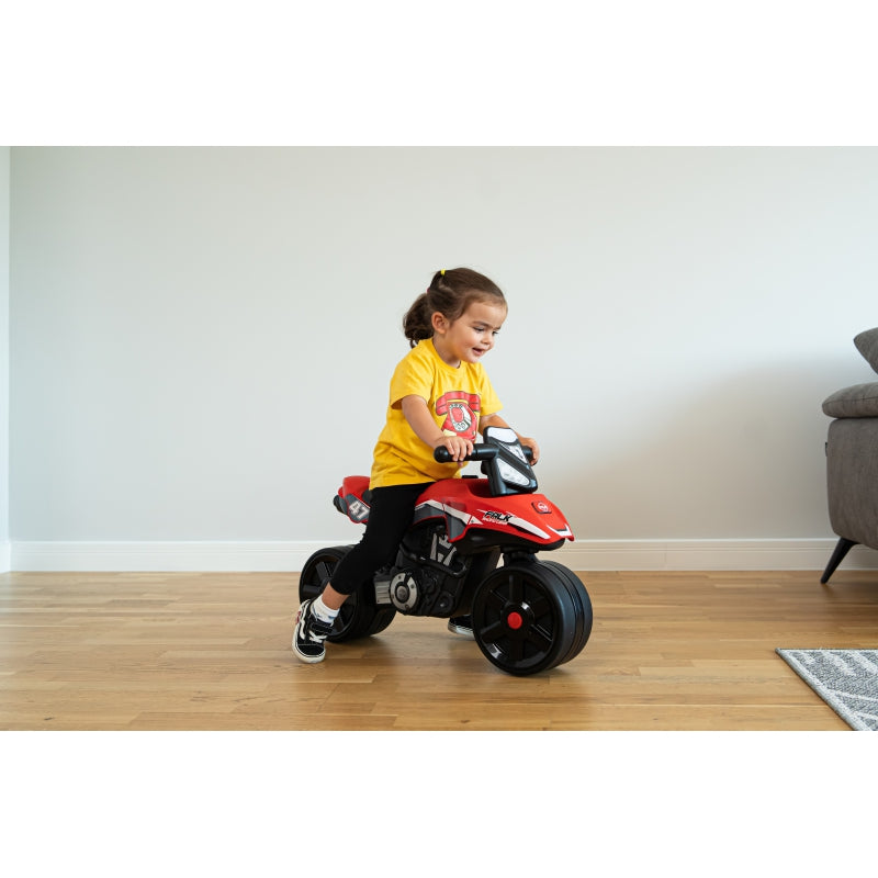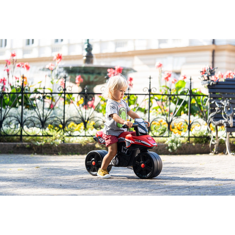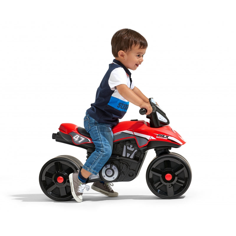 Prancūzijos važinėjimo priemonių gamintojo „Falk“ lenktyninis motociklas yra puiki dovana vaikui nuo 12 mėnesių. Graži grafika ir labai tikroviškas dizainas suteiks daug džiaugsmo mažiesiems. Pasivažinėjimo motociklas aprūpintas dideliais ratais, kurie puikiai važiuos įvairiais paviršiais. Priekinis ratas yra pasukamas, kad būtų patogiau vairuoti ir sukti.