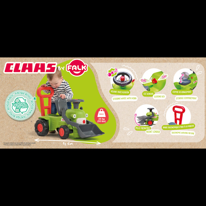 Falk traktoriukas su priekaba yra daugelio mažųjų traktorininkų svajonė. Pagamintas kruopščiai, atkreipiant dėmesį į menkiausias detales. CLAAS traktorius su kaušu ir priekaba pagamintas iš aukštos kokybės medžiagų. Šis traktorius tikrai pasitarnaus jaunajam ūkininkui sode ar kieme.