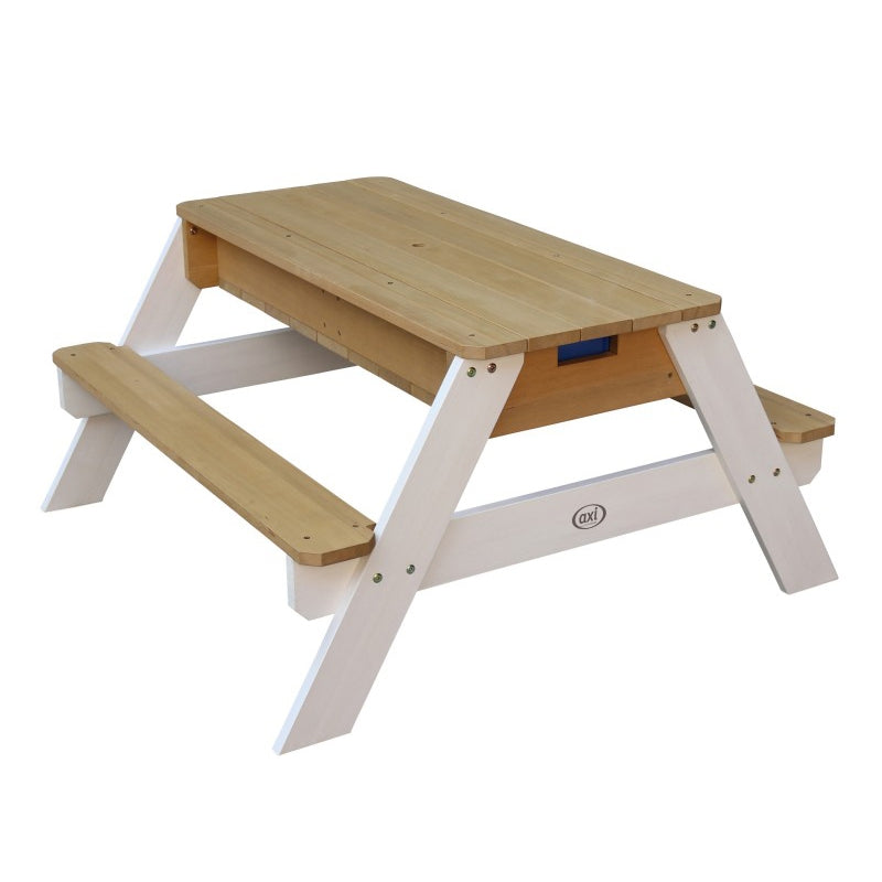 „Nick“ iškylos stalas iš garsaus AXI prekės ženklo yra daugiafunkcis stalas, kuriame po nuimamu viršumi yra slapta vieta su dviem mėlynomis talpyklomis. Šie mėlyni indai gali būti užpildyti smėliu ir (arba) vandeniu, tačiau, žinoma, juose taip pat galima laikyti žaislus. Be to, konteineriai yra nuimami, todėl juos lengva valyti. Klasikinis smėlio ir vandens derinys visada tinka vaikams!