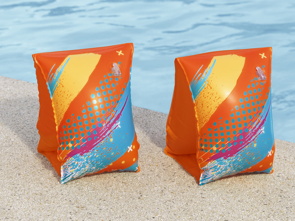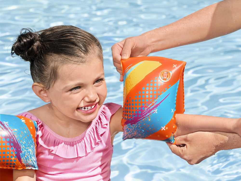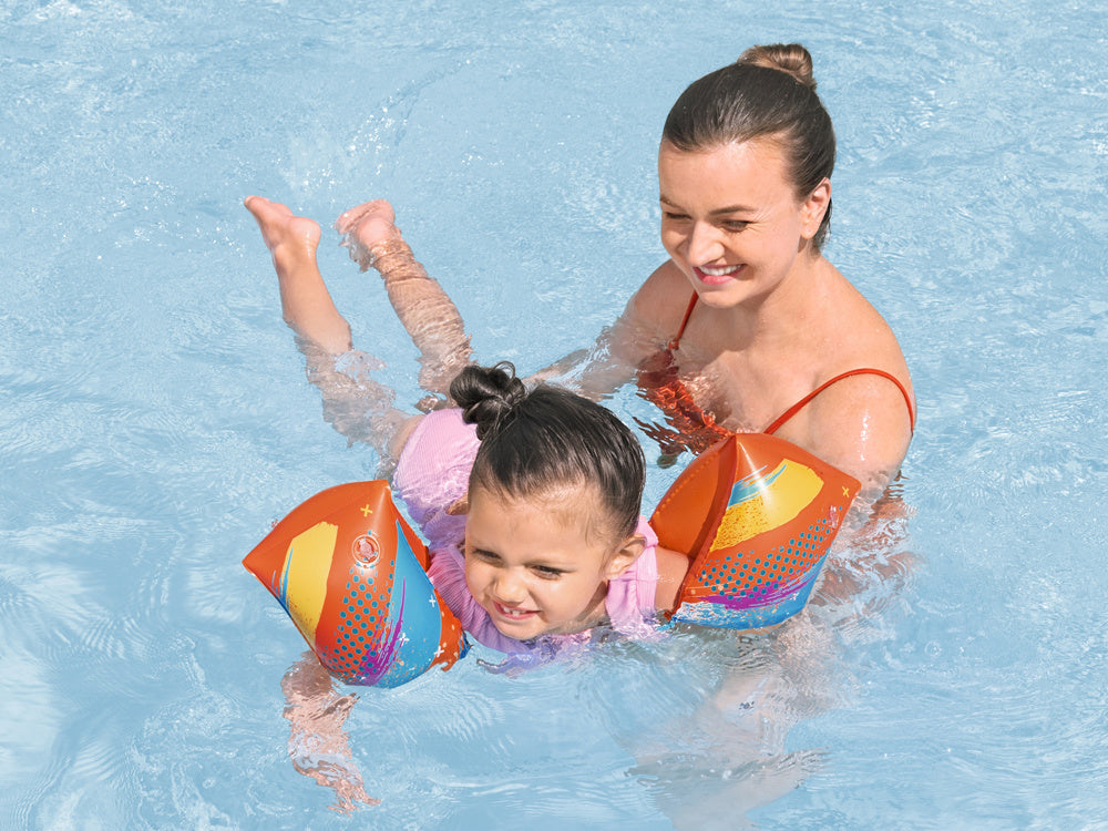 " Bestway" pripučiamos plaukimo rankovės yra būtina įranga vaikui, kuris dar nemoka savarankiškai plaukti. Minkšta ir patogi, atspari pradūrimui "Tought Lite™" medžiaga ir dvi nepriklausomos oro kameros vaikui plūduriuoti ir užtikrins saugias pramogas vandenyje.