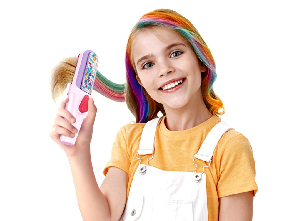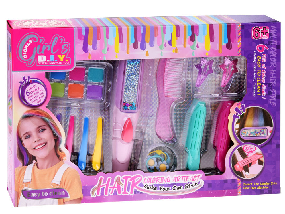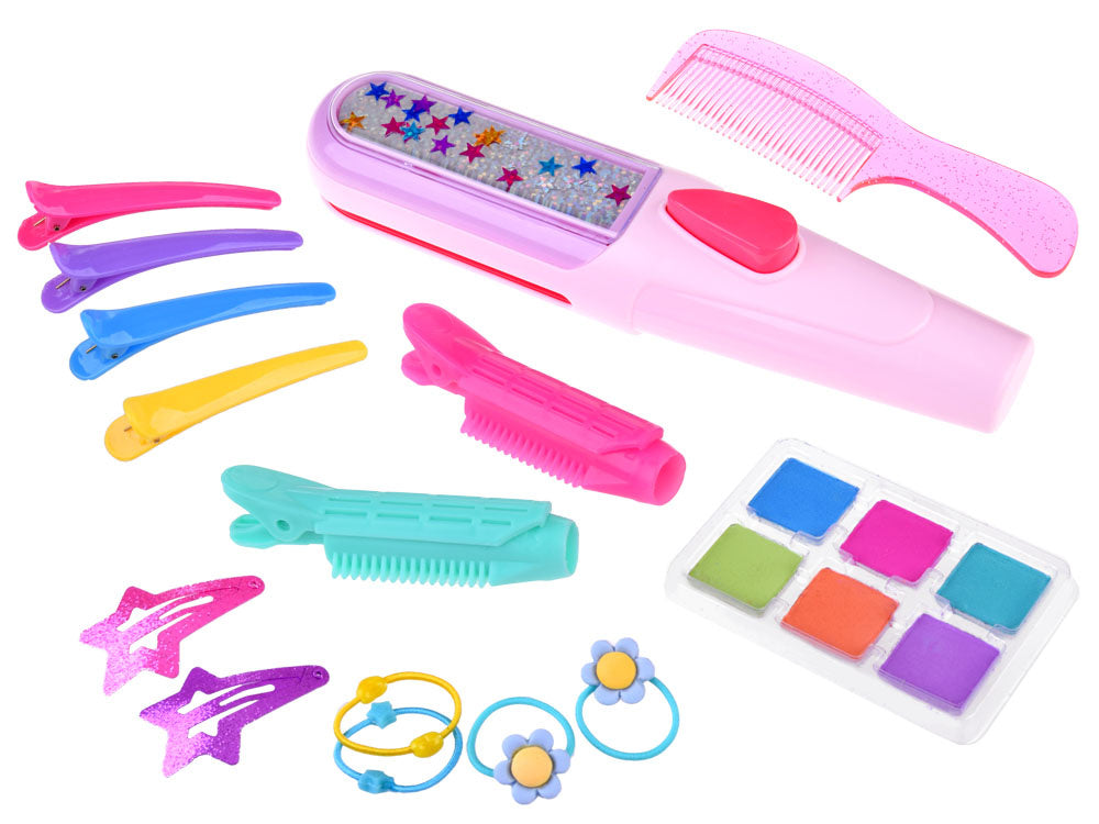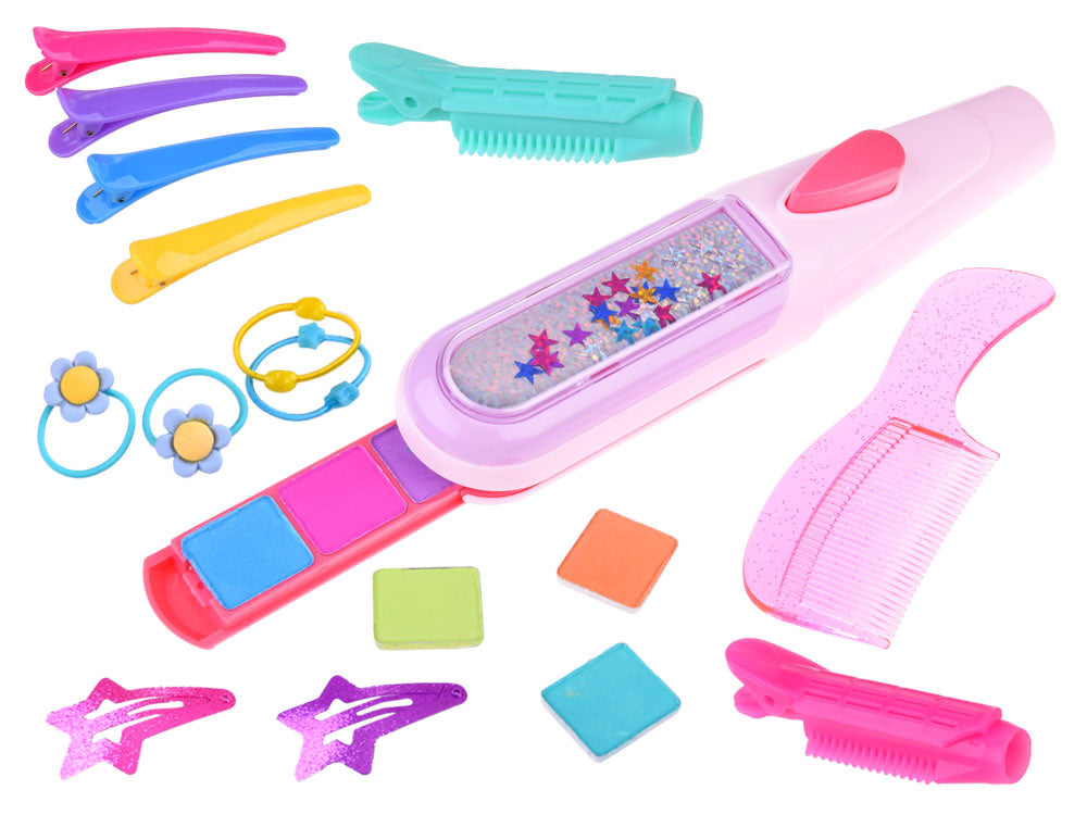 Šis spalvingų plaukų dažymo kreidelių ir priedų rinkinys tikrai patiks kiekvienam mažam vaikui. Spalvinga plaukų dažymo kreida yra hitas! Rinkinyje yra visi reikalingi priedai, su kuriais galima susikurti naują spalvingą šukuoseną. Spalvoti segtukai ir plaukų gumelės pagražins šukuoseną. Kad pasiektumėte geriausių rezultatų, pirmiausia sudrėkinkite plaukus vandeniu. Išstumkite plokštelę iš dažymo prietaiso ir uždėkite ant jos plyteles su pasirinktomis spalvomis, tada įstumkite ją į prietaisą. Dabar tereikia lėtai vilkti prietaisą per plaukus ir viskas baigta! Jei norite išgauti intensyvesnį efektą, vilkite tą pačią spalvą kelis kartus per tą pačią plaukų sruogą. Jūsų plaukai paruošti! Rinkinys supakuotas į akį traukiančią spalvingą dėžutę su langeliu, todėl puikiai tinka dovanoti.