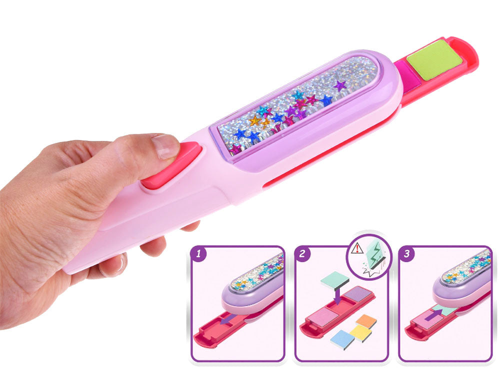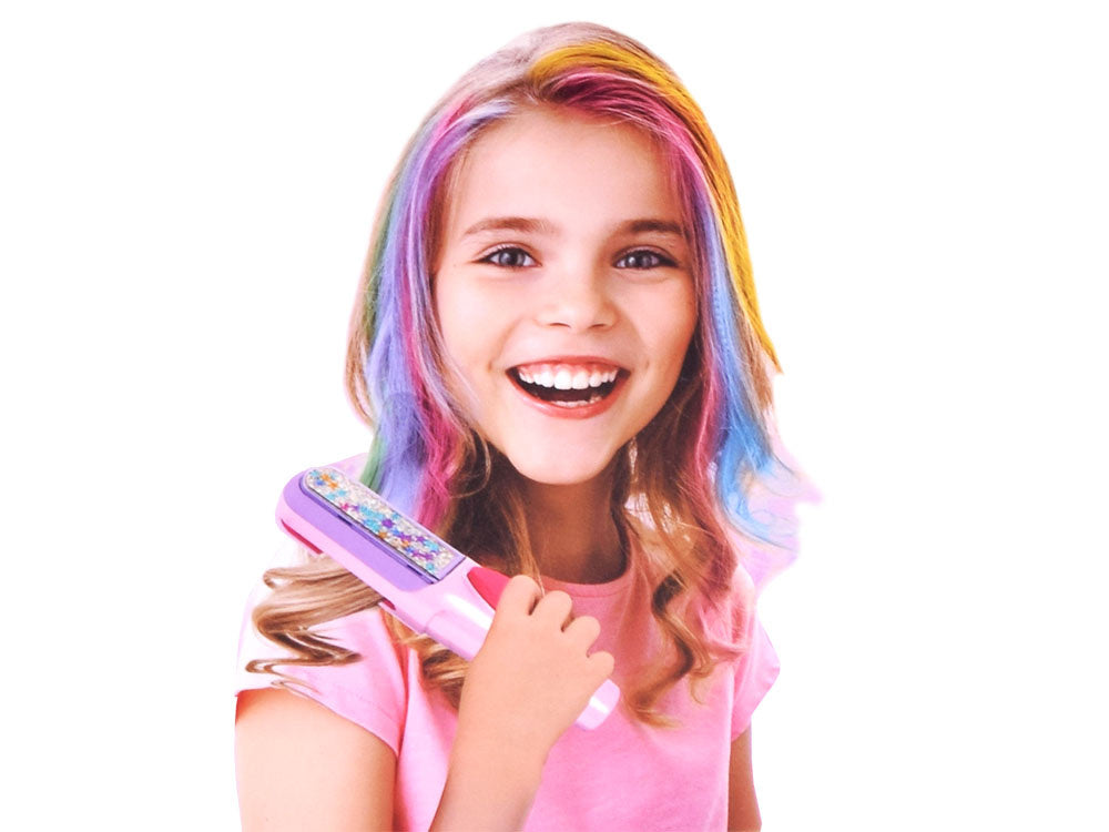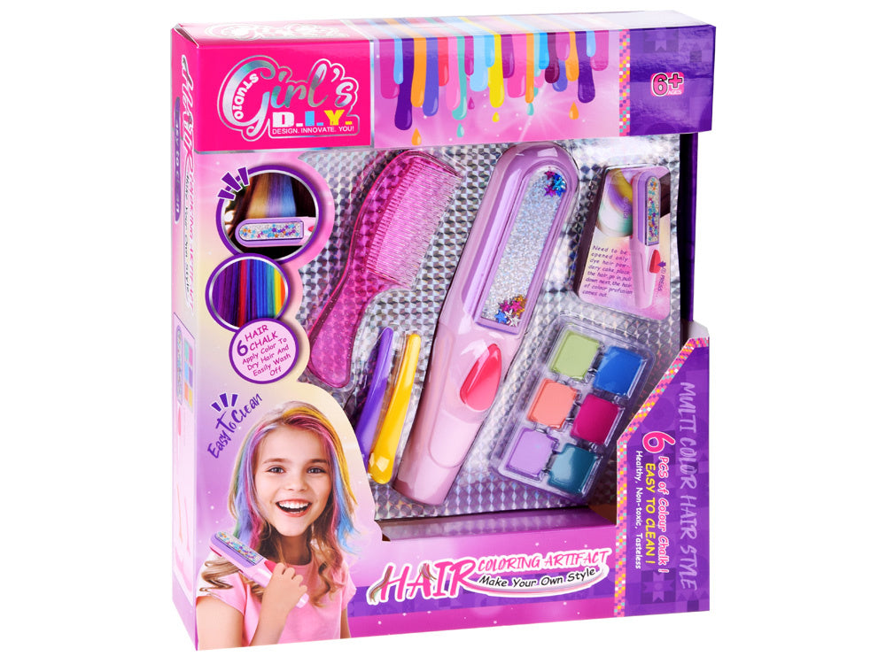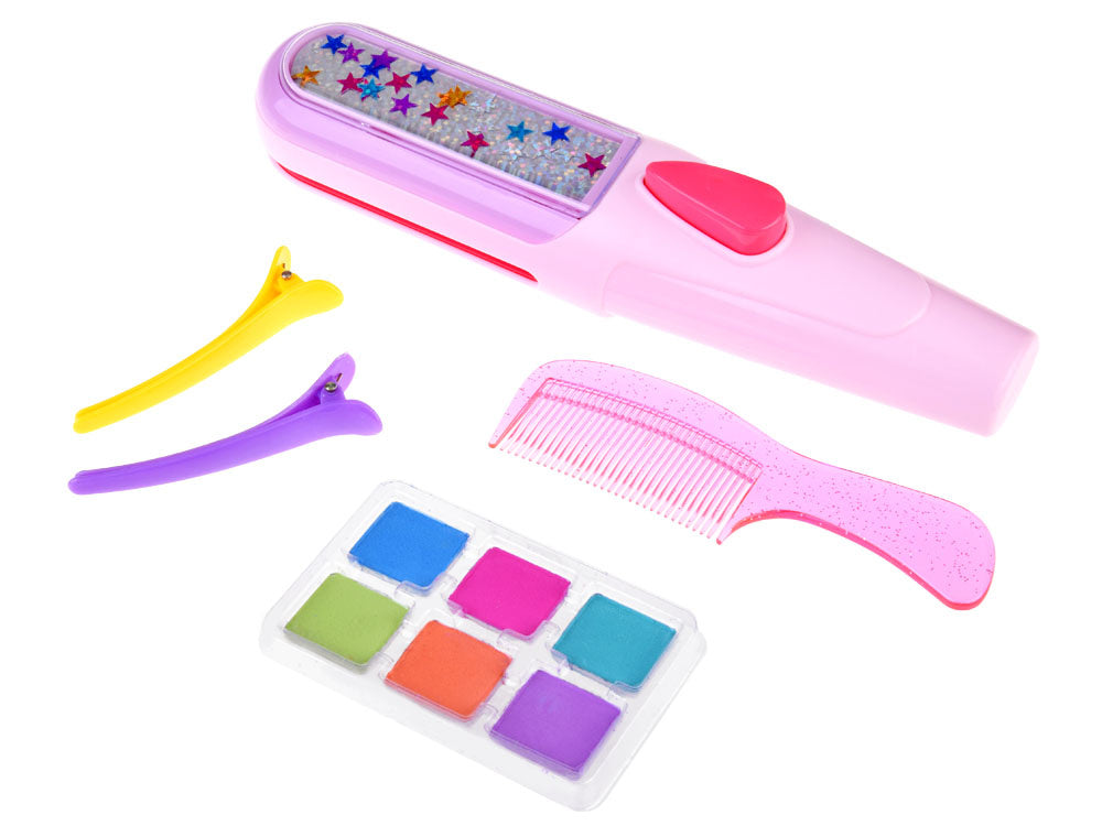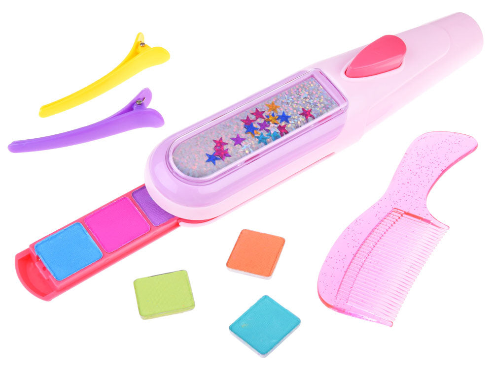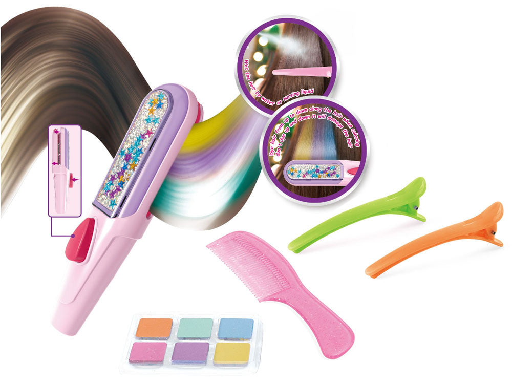 Spalvingas plaukų dažymo kreida rinkinys tikrai patiks kiekvienam vaikui. Spalvinga plaukų dažymo kreida - tai hitas! Rinkinyje yra visi reikalingi priedai, su kuriais galite susikurti naują spalvingą šukuoseną. Kad pasiektumėte geriausių rezultatų, pirmiausia sudrėkinkite plaukus vandeniu. Išstumkite plokštelę iš dažymo prietaiso ir uždėkite ant jos plyteles su pasirinktomis spalvomis, tada įstumkite ją į prietaisą. Dabar tereikia lėtai vilkti prietaisą per plaukus ir viskas baigta! Jei norite išgauti intensyvesnį efektą, vilkite tą pačią spalvą kelis kartus per tą pačią plaukų sruogą. Jūsų plaukai paruošti! Rinkinys supakuotas į akį traukiančią spalvingą dėžutę su langeliu, todėl puikiai tinka dovanoti.