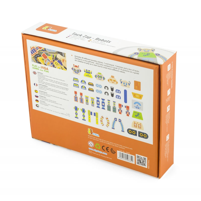 - Komplekte yra 45 prikalami mediniai elementai, vinukai, kamštinė lenta, medinis plaktukas ir 5 korteles, kuriose pavaizduoti 10 robotų, kurie gali būti sujungti su detalėmis.