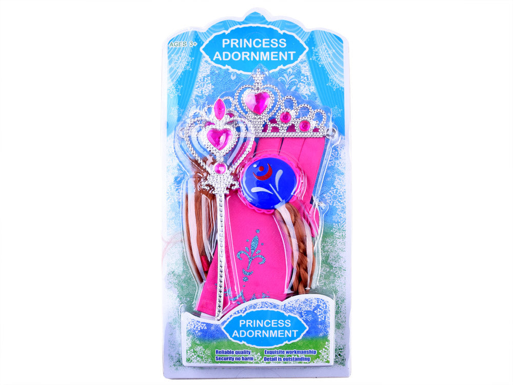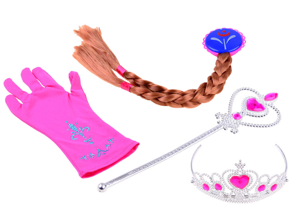Stebuklingas pasakų princesės rinkinys padės kiekvienam vaikui tapti tikra princese. Tamsiai mėlynas dekoratyvinis segtukas su ilga kasa, lengvai uždedamas. Visi komplekto elementai yra saugūs, papuošalų elementai – iš plastiko, pirštinė – iš hipoalerginio poliesterio, o plaukai – iš plastiko.