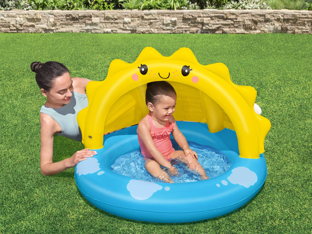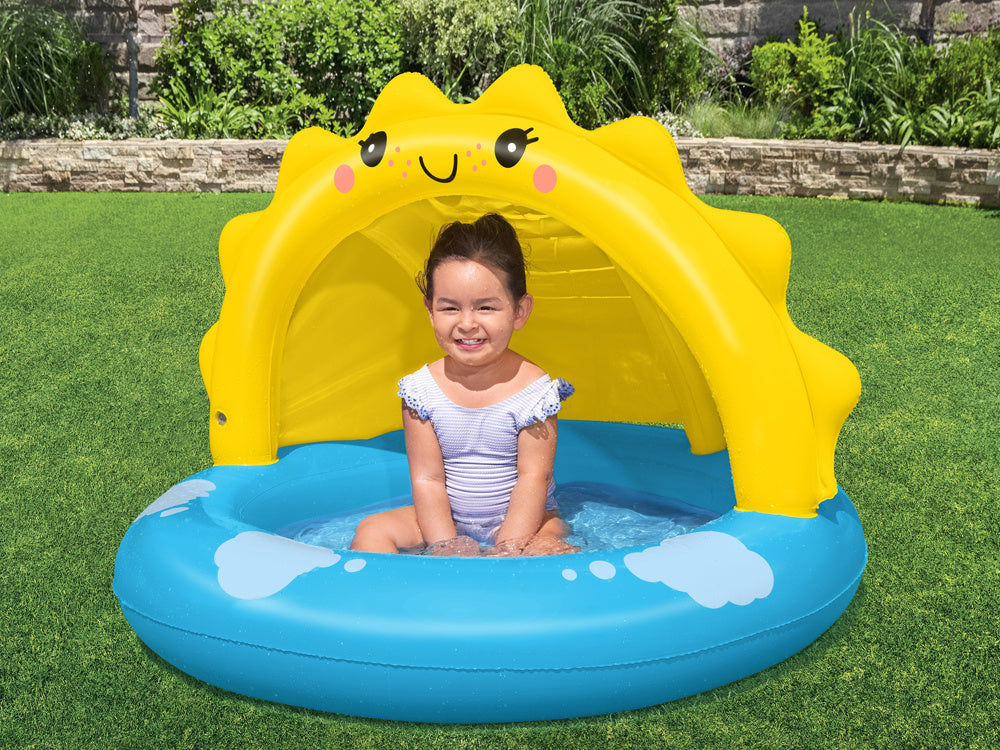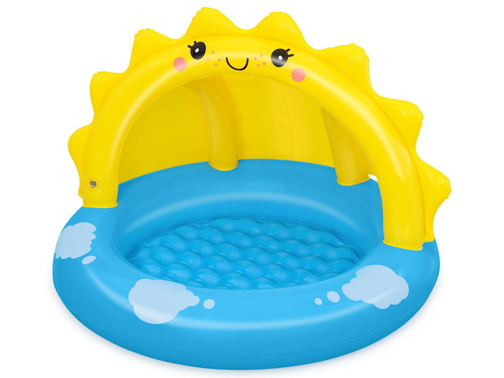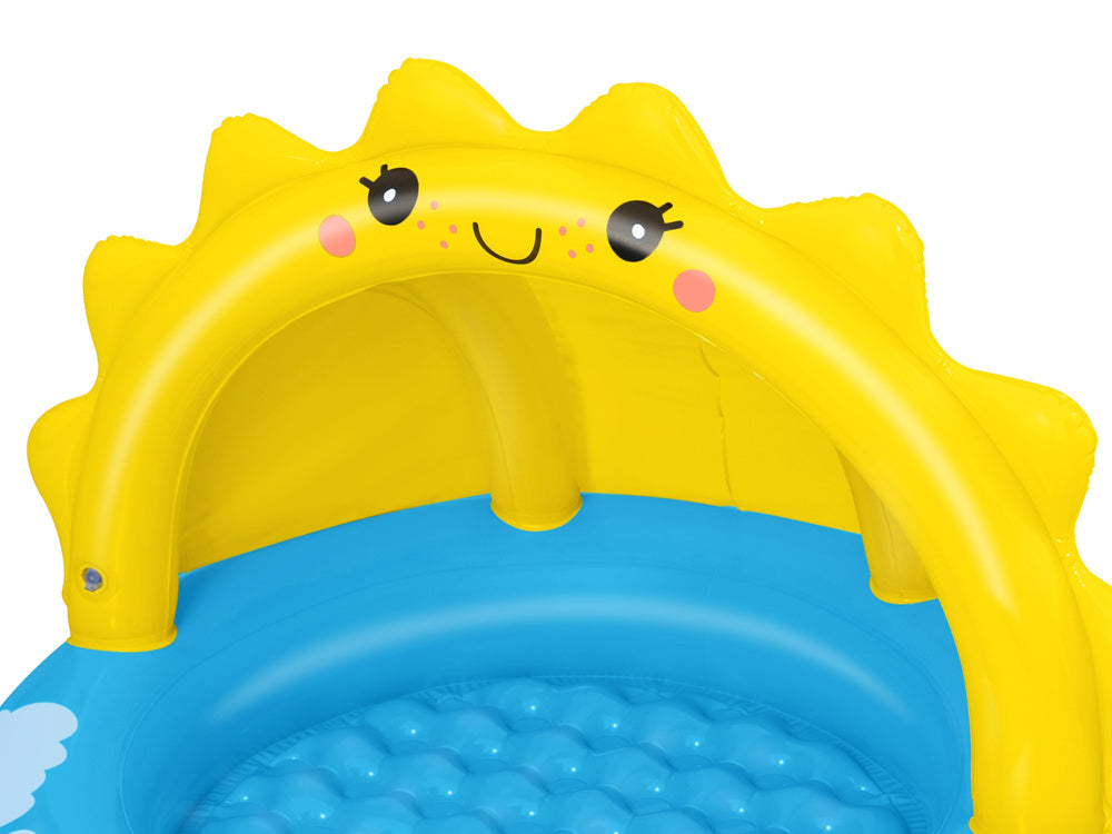 "Bestway" baseinas su besišypsančios geltonos saulutės mėlyname danguje su debesėliais, stogeliu ir minkštu banguotu dugnu tikrai patiks kiekvienam vaikui. Stogelis apsaugos nuo saulės, o minkštas, pripučiamas, banguotas dugnas užtikrins patogų sėdėjimą, neleis paslysti ir amortizuos atsitiktinius kritimus. Baseinas pagamintas iš minkštos, bet patvarios medžiagos, kuri pagerina naudojimo patogumą.