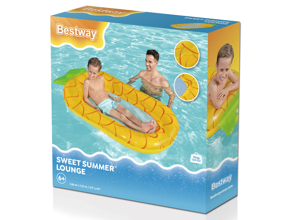 Su kuo mums asocijuojasi atostogos? Su linksmybėmis, poilsiu, skaniais, sultingais vaisiais ir, žinoma, vandens šėlsmu! „Bestway“ sujungė visus šiuos dalykus ir sukūrė fantastiškos, vaisinės grafikos gulto, vandens hamako vaikams. Čiužinį sudaro dvi oro kameros, o dugnas pagamintas iš patvaraus tinklelio, leidžiančio nuolat kontaktuoti su vandeniu.