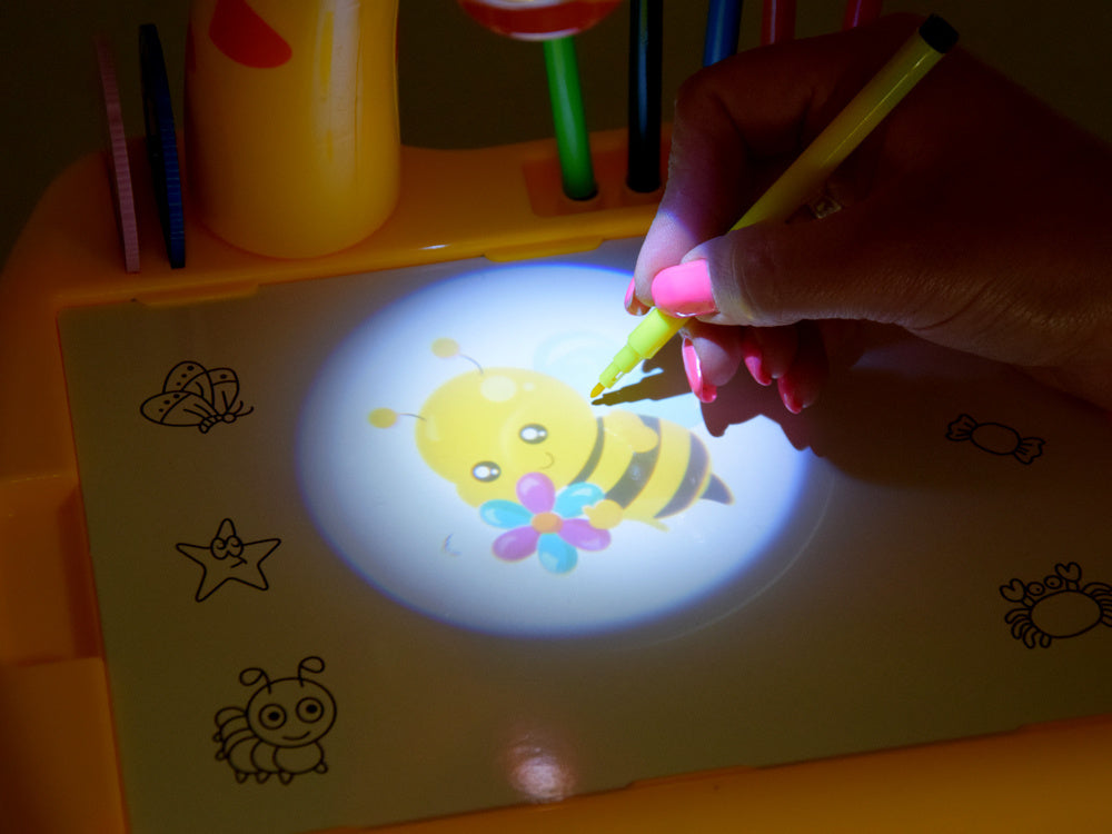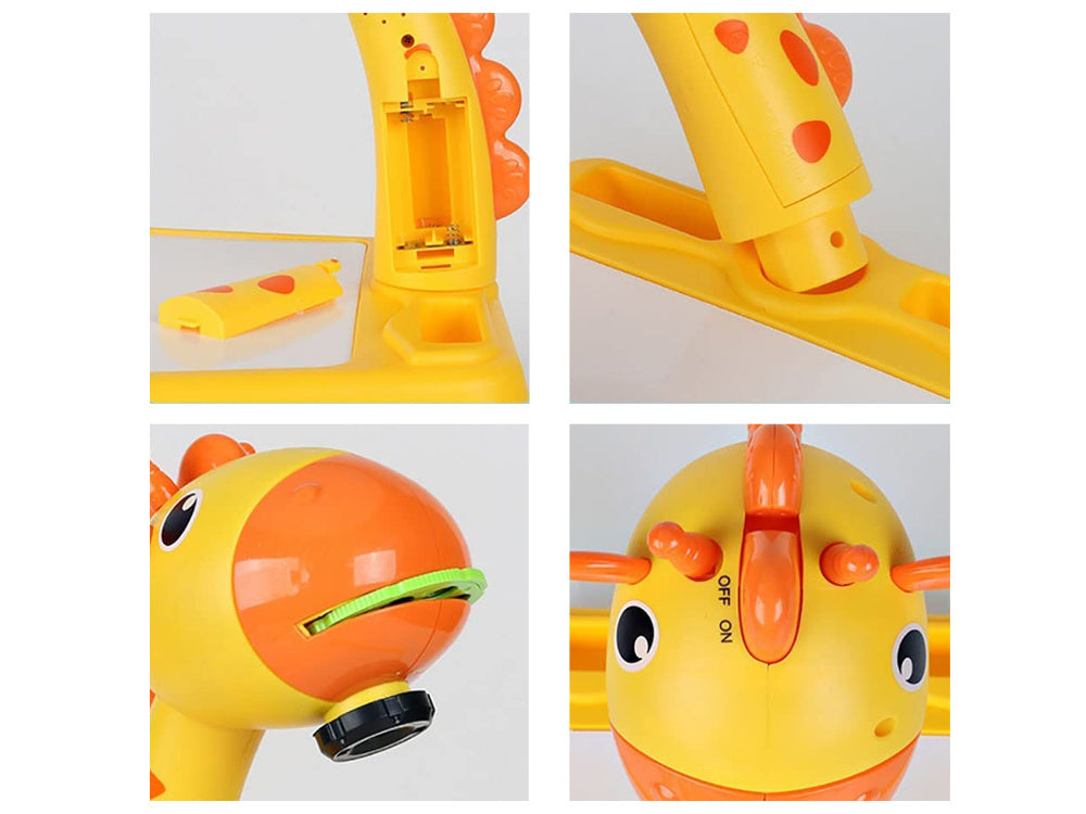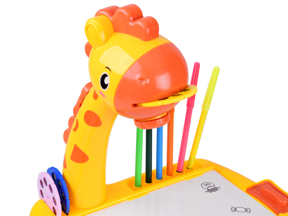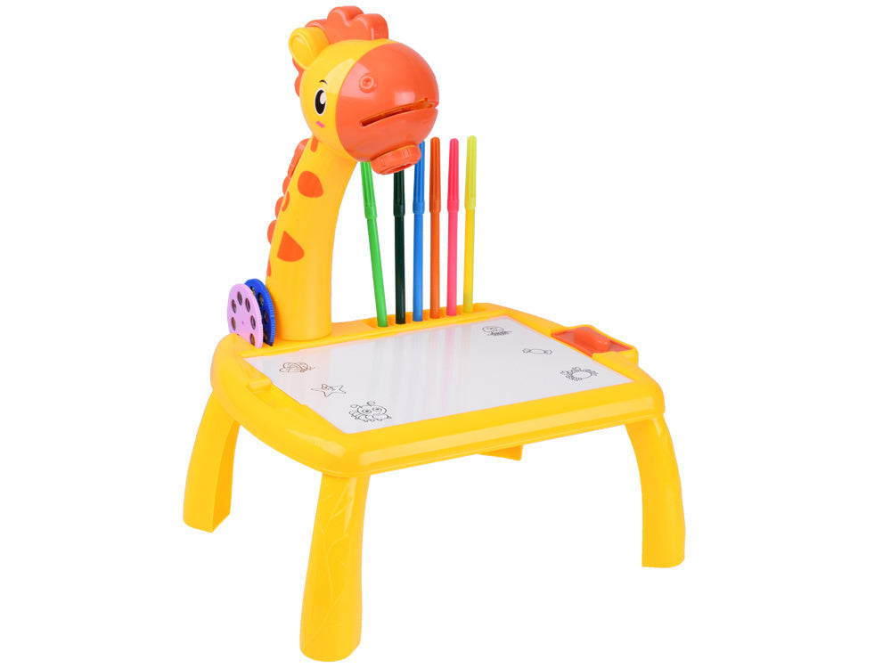 Žirafos projektorius - tai žavus žaidimų rinkinys kiekvienam vaikui, mėgstančiam dirbti su menu, piešti, tapyti, žiūrėti paveikslėlius ir kurti savo unikalias istorijas bei pasakojimus. Žirafos projektorius turi stalviršį, ant kurio vaikas galės išdėlioti rašiklius ir piešti, kopijuoti rodomus paveikslėlius iš projektoriaus. Stalviršį galima padėti lygiai ant savo rašomojo stalo, stalelio arba prie jo pritvirtinti keturias kojeles ir sukurti nedidelį rašomąjį stalą.