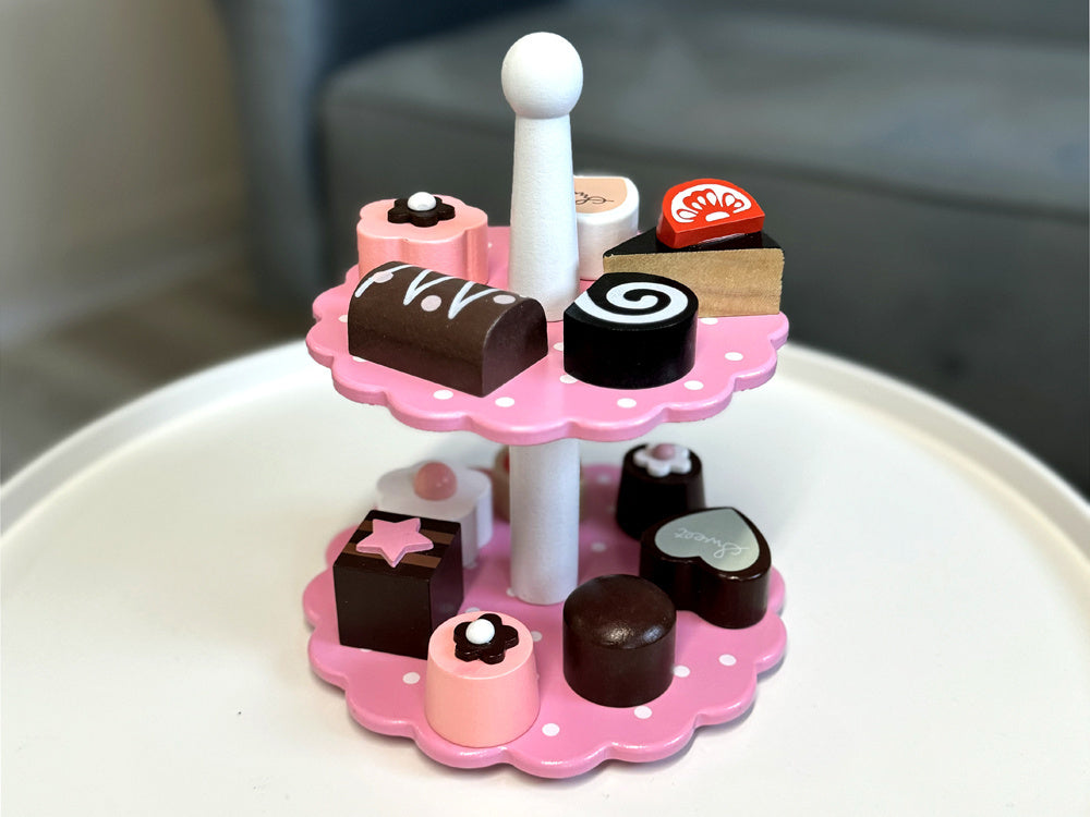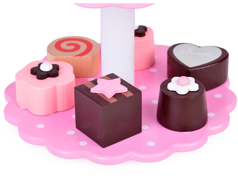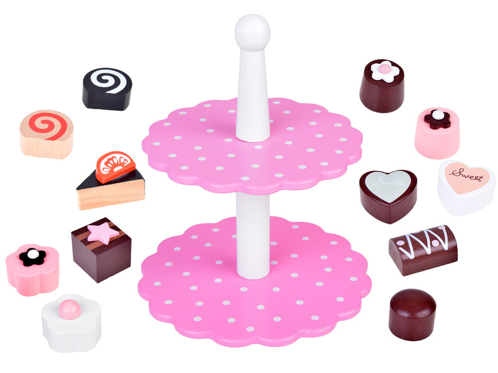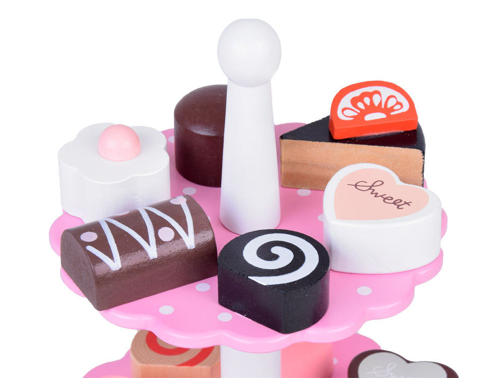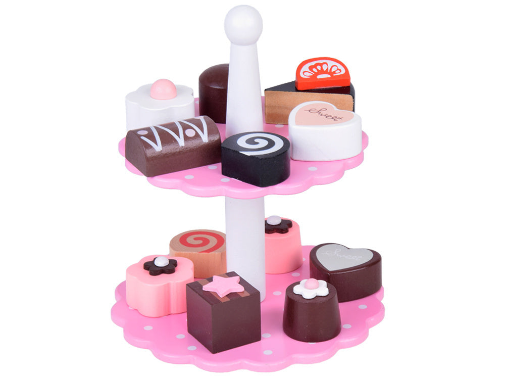 Puošnus medinių tortų lėkščių rinkinys su konditerijos gaminiais