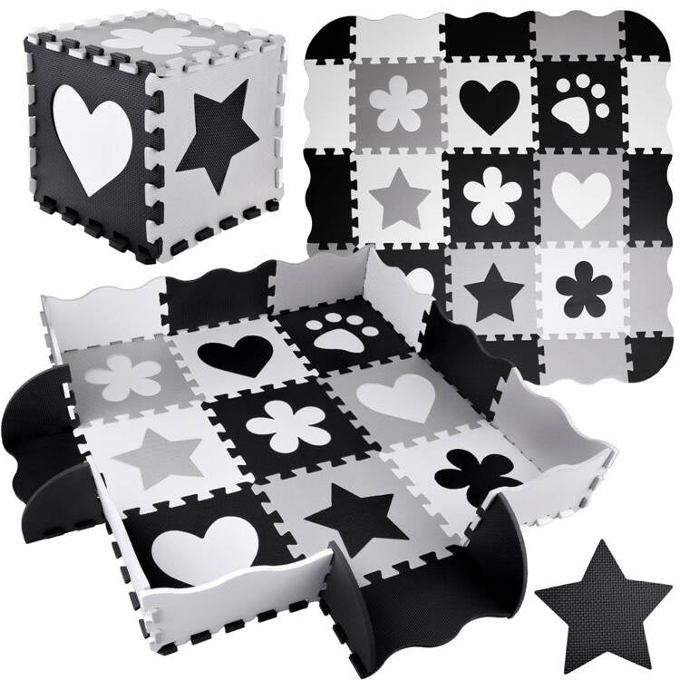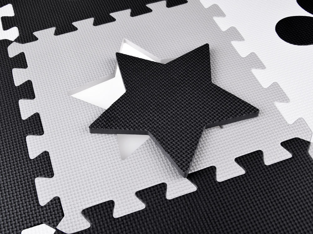 Kūdikiams ir vaikams skirtas putplasčio kilimėlis, sudarytas iš minkštų madingų, santūrių pilkos ir baltos spalvų dėlionių. Rinkinį sudaro 16 putplasčio dėlionių. Dėl universalių spalvų jis tiks bet kuriame vaikų kambaryje. Kilimėlio elementus galima laisvai jungti arba dalyti, todėl jį lengva pritaikyti bet kokiame kambaryje.