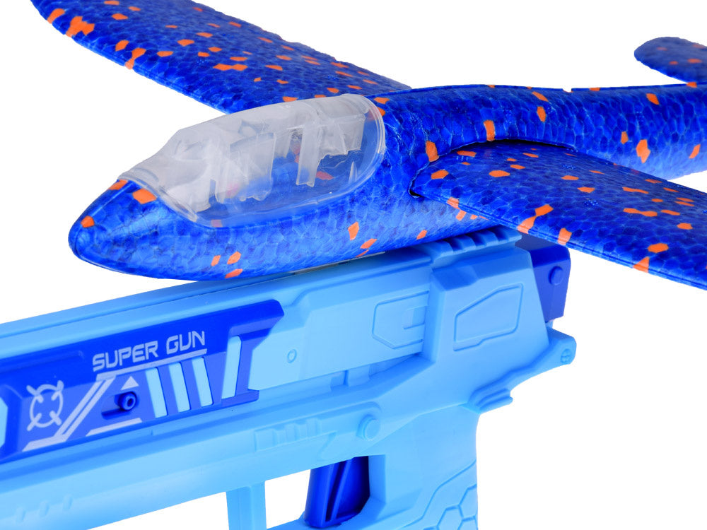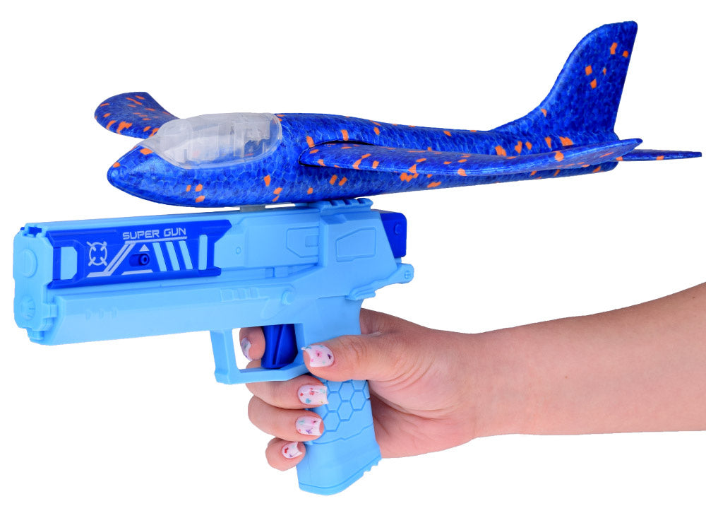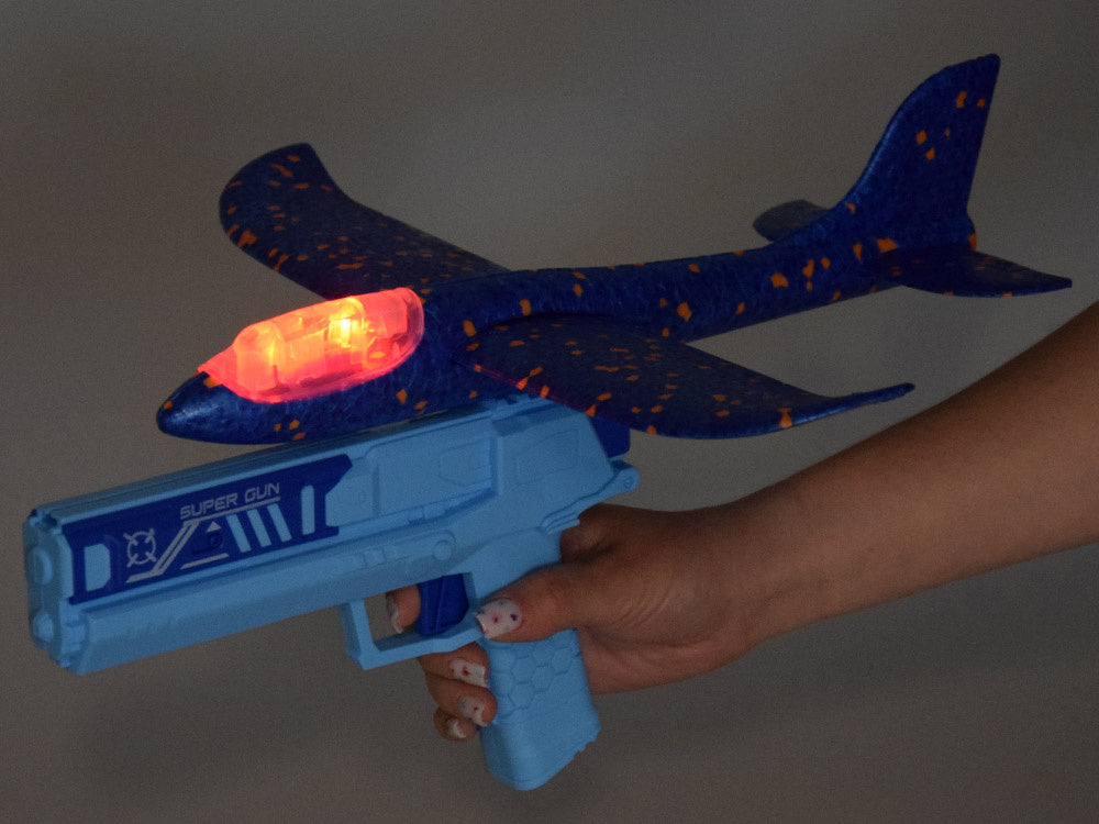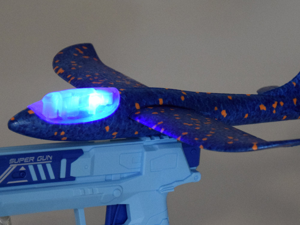 Putplasčio lėktuvas šaudomas iš pistoleto su šviesos efektais, mėlynas