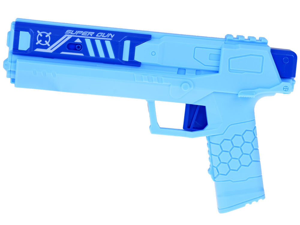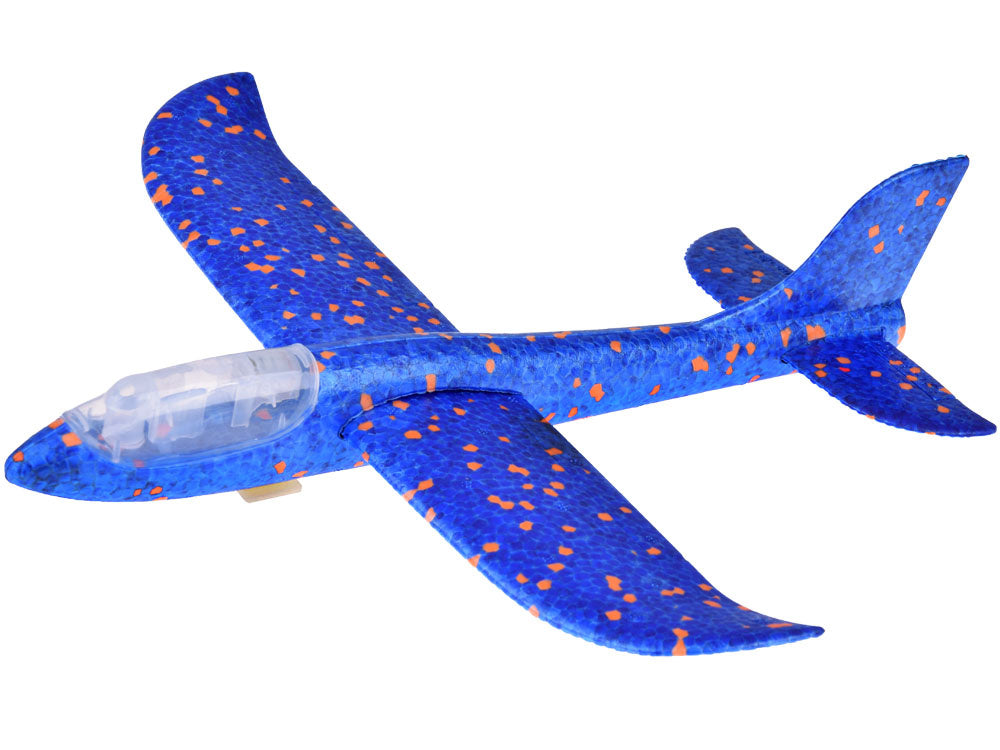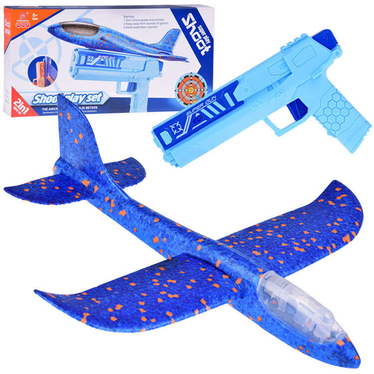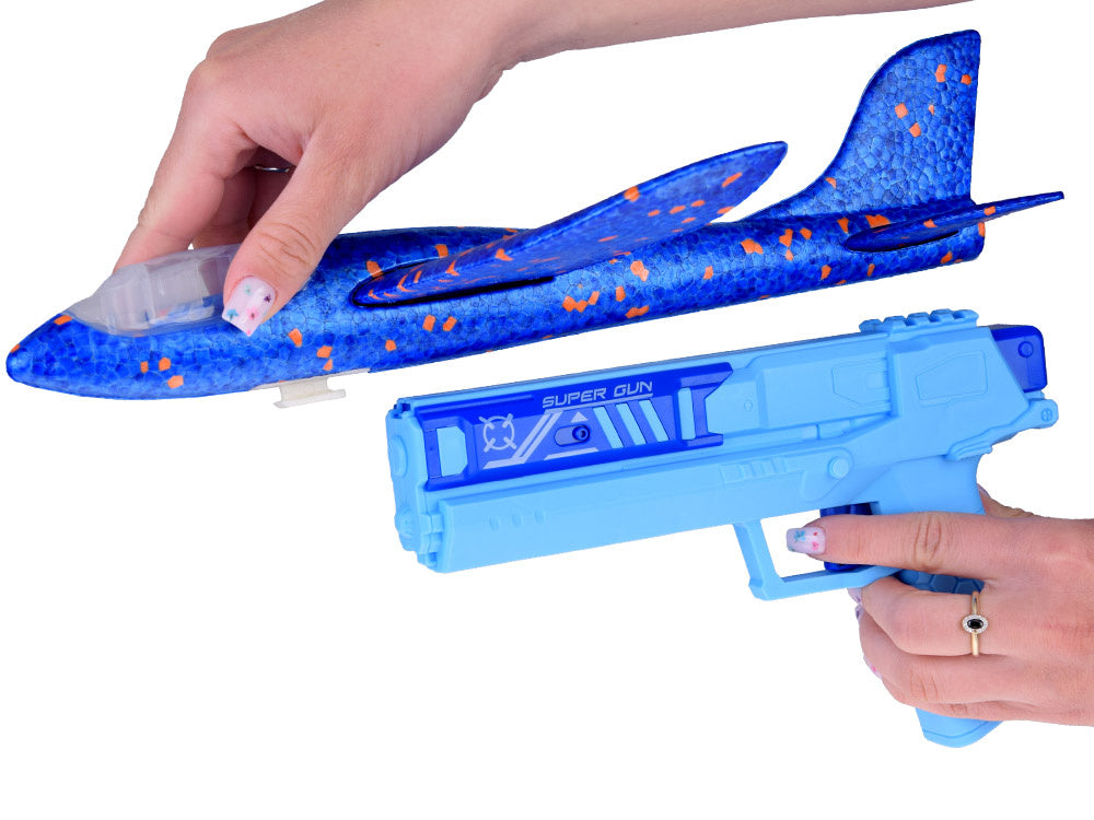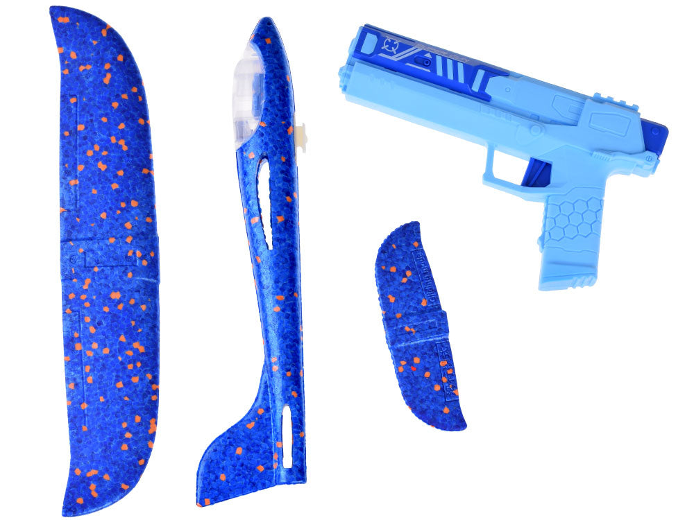 Putplasčio lėktuvas šaudomas iš pistoleto su šviesos efektais, mėlynas