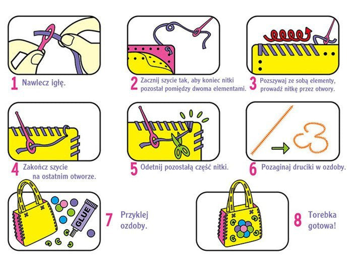 Super kūrybingas rinkinys rankinei kurti. Kiekvienas vaikas, kuris mėgsta siuvinėjimą, tapybą, mezgimą, nudžiugs gavęs šį rinkinį. Kurkite rankinę nuo pagrindų, kurkite spalvingą apdailą ir aksesuarus – gražus galutinis rezultatas jus nustebins.