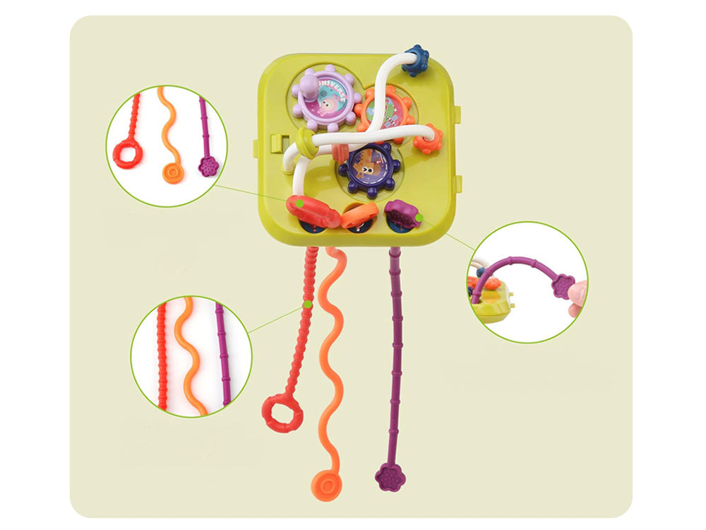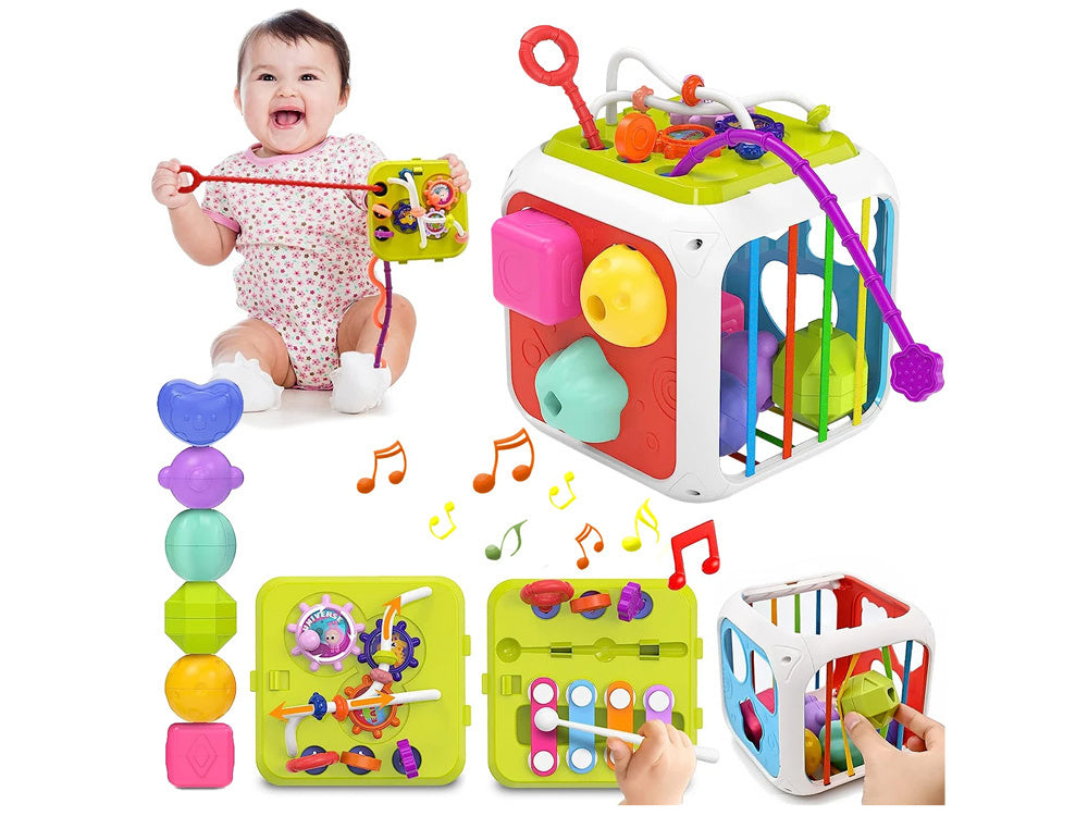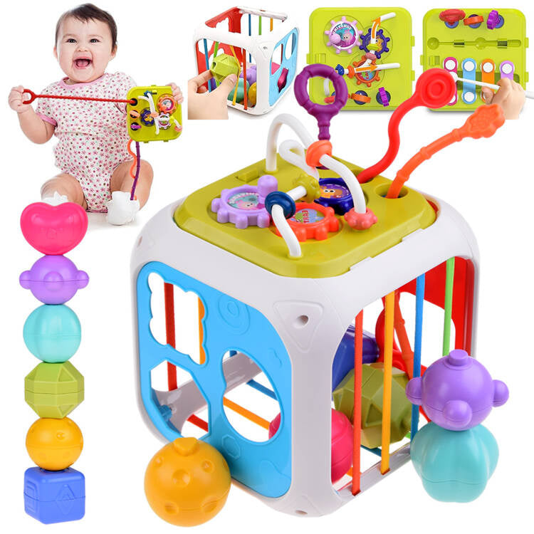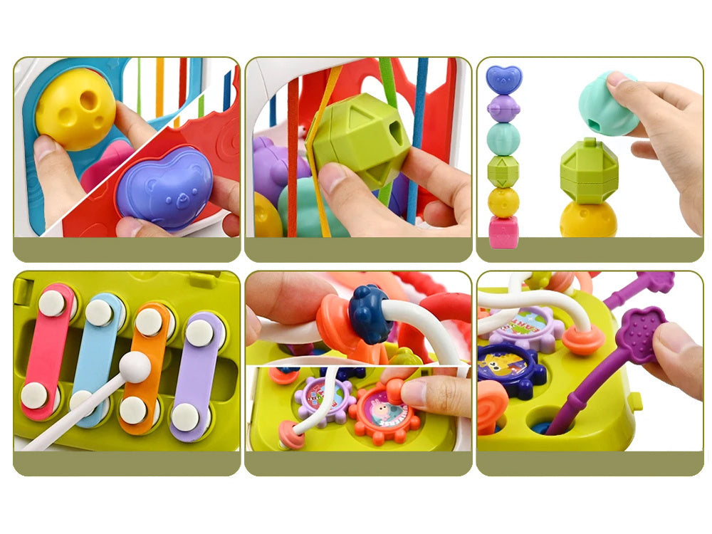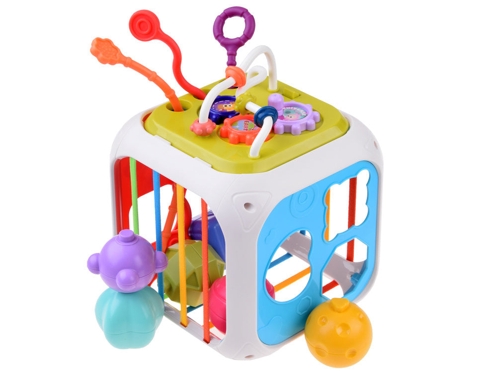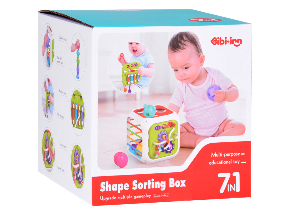 Rūšiavimo žaislas - tai gaminys, kuris tikrai sudomins ir patrauks kiekvieno vaiko akį. Vaiko užduotis - suderinti kaladėlės formą su atitinkama skyle. Be to, paskutinę sienelę galima naudoti iš abiejų pusių. Pirmoje pusėje yra mažos spalvotos kaladėlės ir skirtingos tekstūros virvelės, kurias reikia traukti iš vienos pusės į kitą. O kitoje pusėje yra spalvingi ritinėliai ir galimybė perkelti mažus spalvingus karoliukus. Kiekvienas blokelis išsiskiria ir skatina vaiko smalsumą juos išimti ir įdėti atgal į rūšiuoklę. Šis žaislas sujungia geriausias rankinių žaislų savybes ir galimybę lavinti mąstymo įgūdžius. Rinkinys supakuotas į spalvingą ir gražią dėžutę, idealiai tinkančią dovanai.