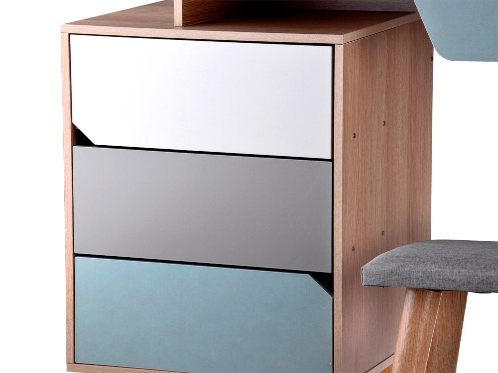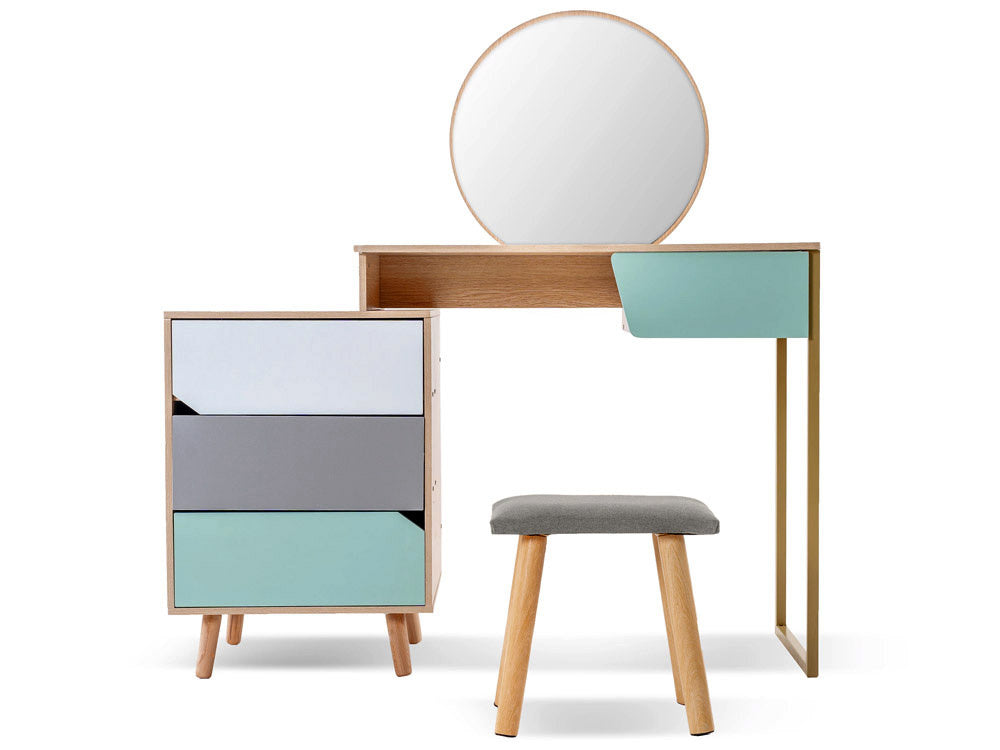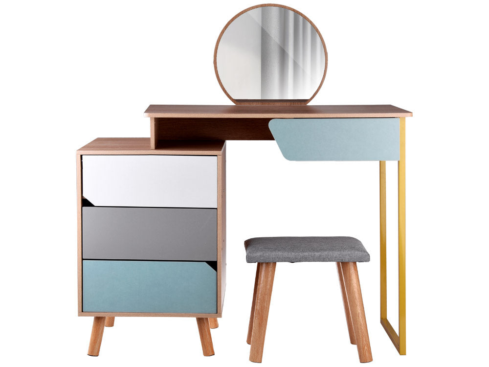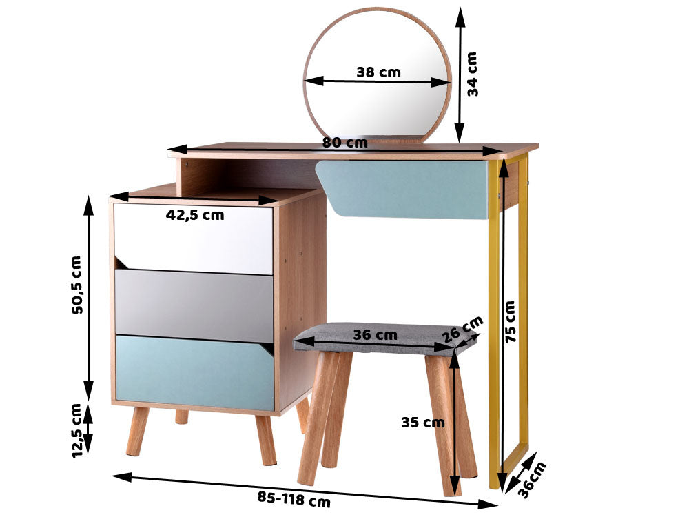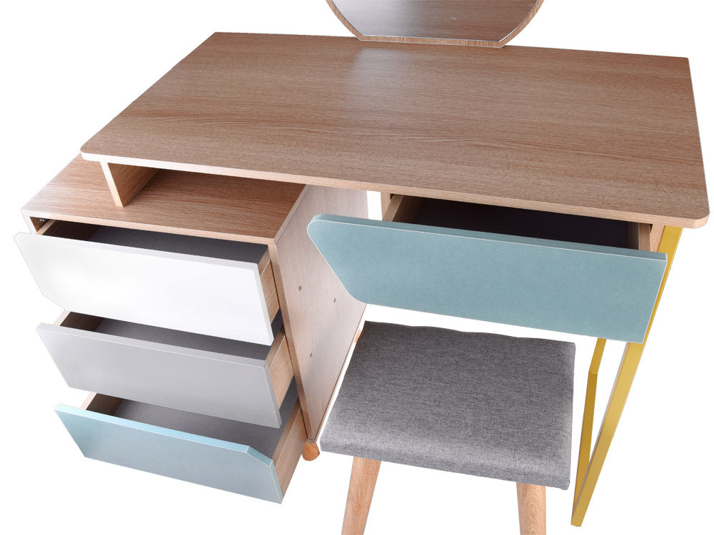 Šiuolaikiškas, ryškių spalvų tualetinis staliukas su dideliu veidrodžiu, stalčiais ir kėdute gali tapti puikiu bet kurios mergaitės kambario aksesuaru. Turintis keturis talpius stalčius, apvalų veidrodį, didelį stalviršį ir minkštą pilku audiniu apmuštą taburetę, tualetinis staliukas tikrai patiks kiekvienai mergaitei. Talpiuose stalčiuose lengvai tilps papuošalai, kosmetika, smeigtukai, plaukų segtukai, plaukų gumytės ir kt.