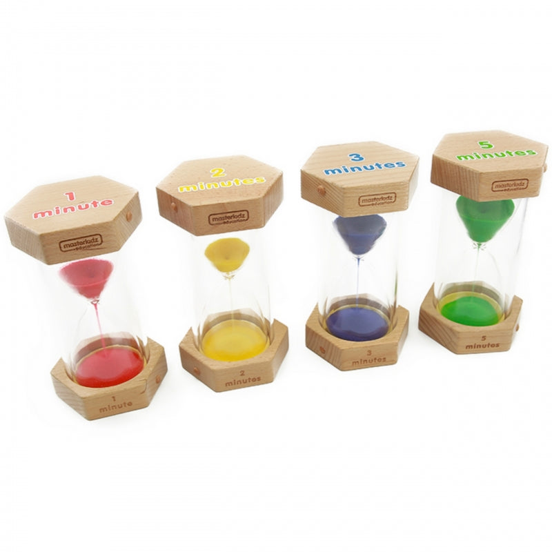 Rinkinį sudaro 4 smėlio laikrodžiai. Kiekvienas iš jų turi skirtingos spalvos smėlį ir skaičiuoja skirtingą laiko atstumą. Rinkinyje taip pat yra medinis dėklas, skirtas smėlio laikrodžiams laikyti.