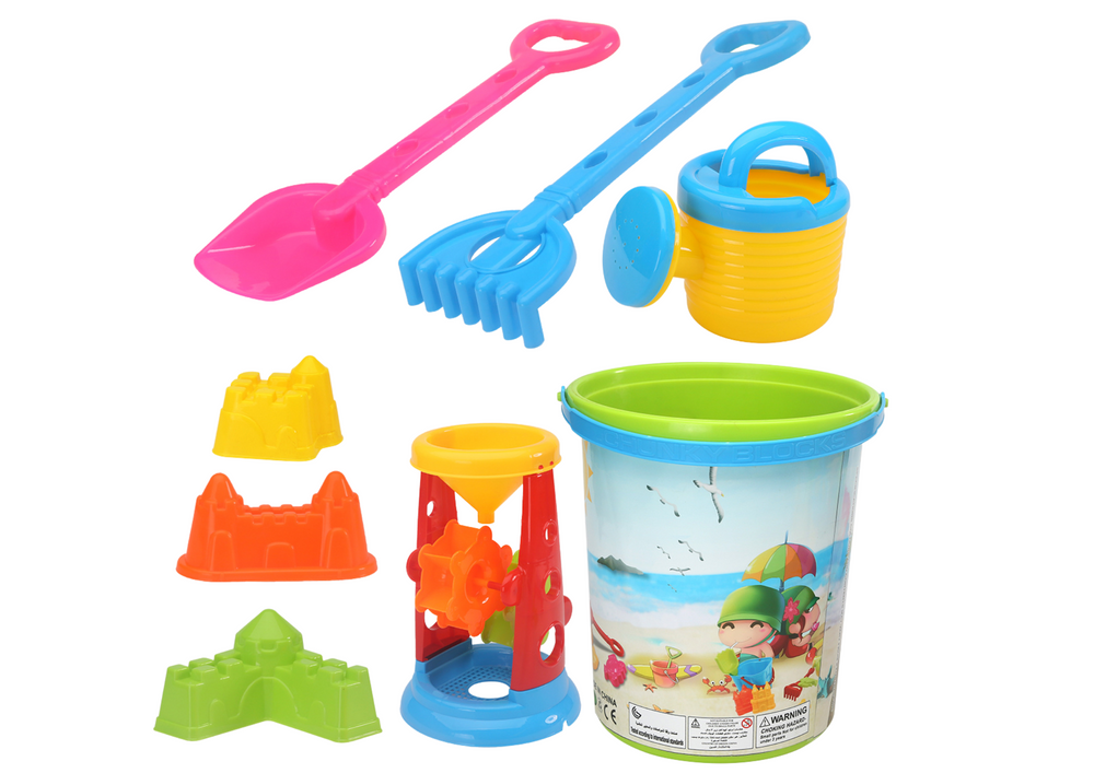 Šis smėlio žaislų rinkinys idealiai tinka vaikams, mėgstantiems žaisti lauke. Pagrindinis elementas - didelis kibiras, papuoštas paplūdimio vaizdais, kurie iš karto atkreipia dėmesį ir skatina žaisti. Rinkinyje taip pat yra malūnėlis, kastuvėlis, grėbliai, trys formelės ir laistytuvas, todėl tai yra pilnas rinkinys kūrybiškiems smėlio žaidimams.