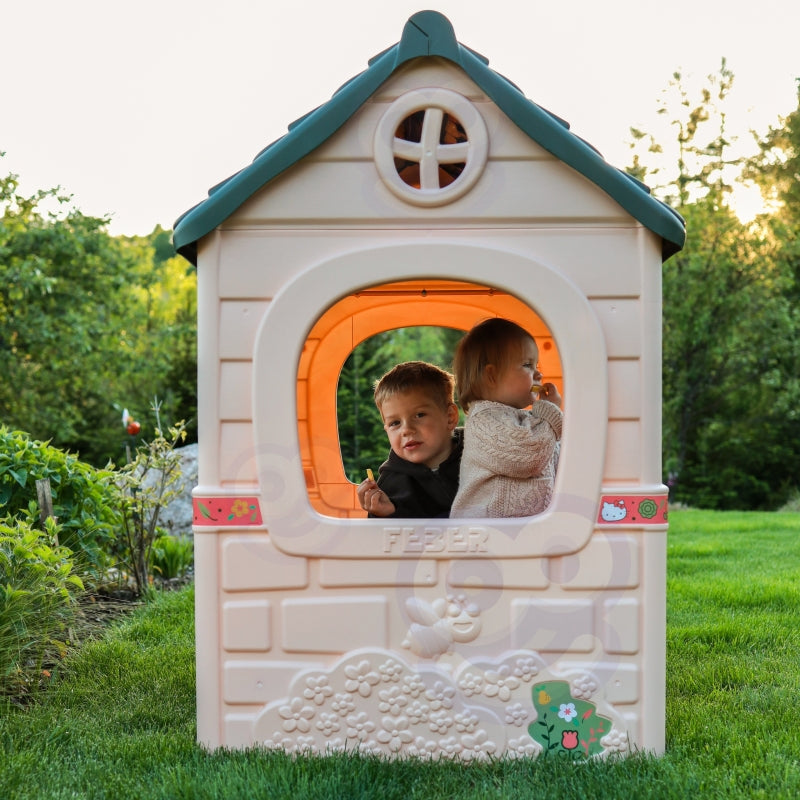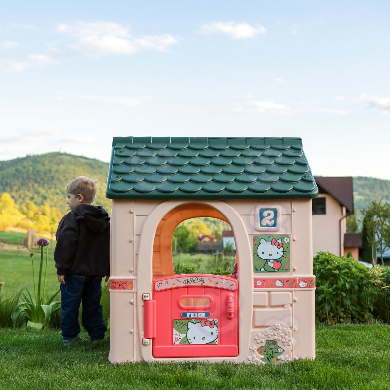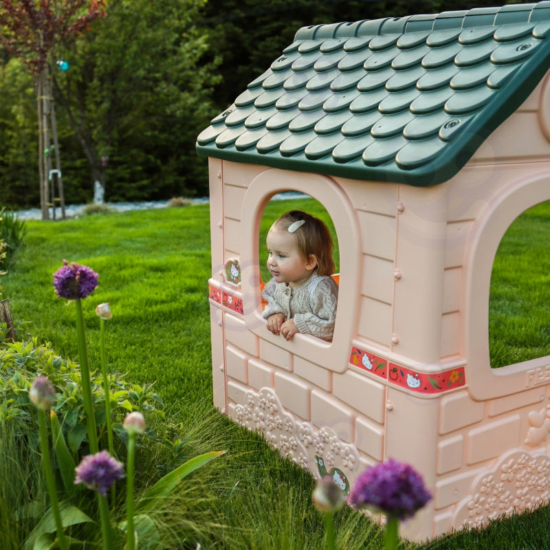 Šis mielas pastelinės rožinės spalvos namelis su tamsiai žaliu stogu - tikra džiaugsmo karalystė! Mūsų nepakeičiamoji Hello Kitty paruošė kažką tikrai ypatingo - ji papuošė namelį savo mėgstamiausiais motyvais, kad kiekvienas vaikas galėtų pasijusti tarsi pasakoje. Ant sienų rasite mielų gėlių ir draugiškų Hello Kitty paveikslėlių, kurie nuo pirmo žvilgsnio privers nusišypsoti.