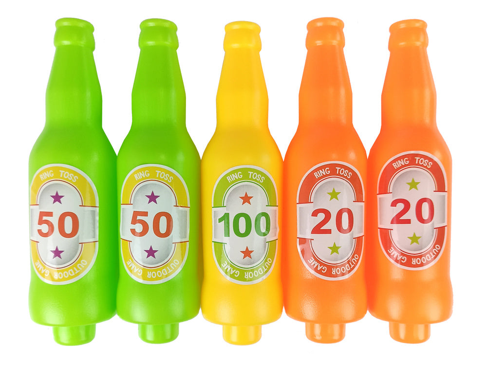 - 5 skirtingų spalvų buteliai (du žali, du raudoni, vienas geltonas)