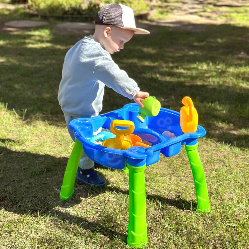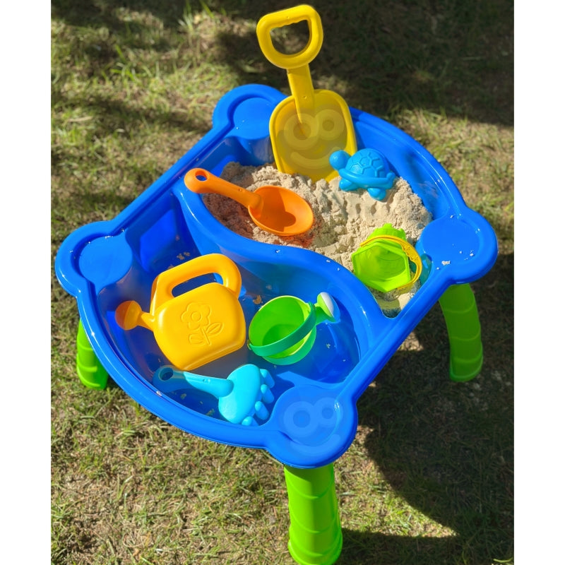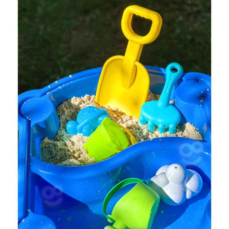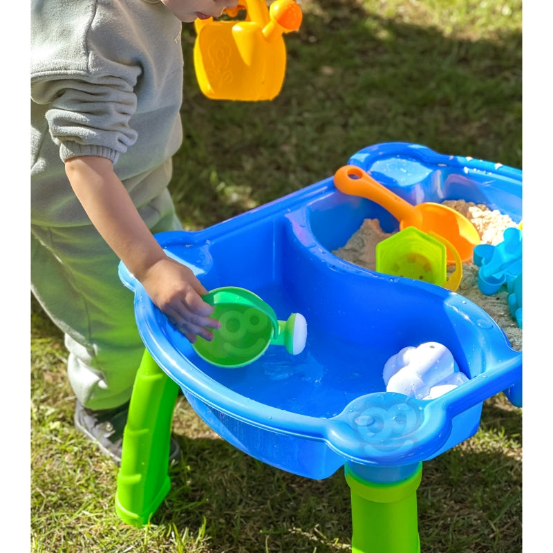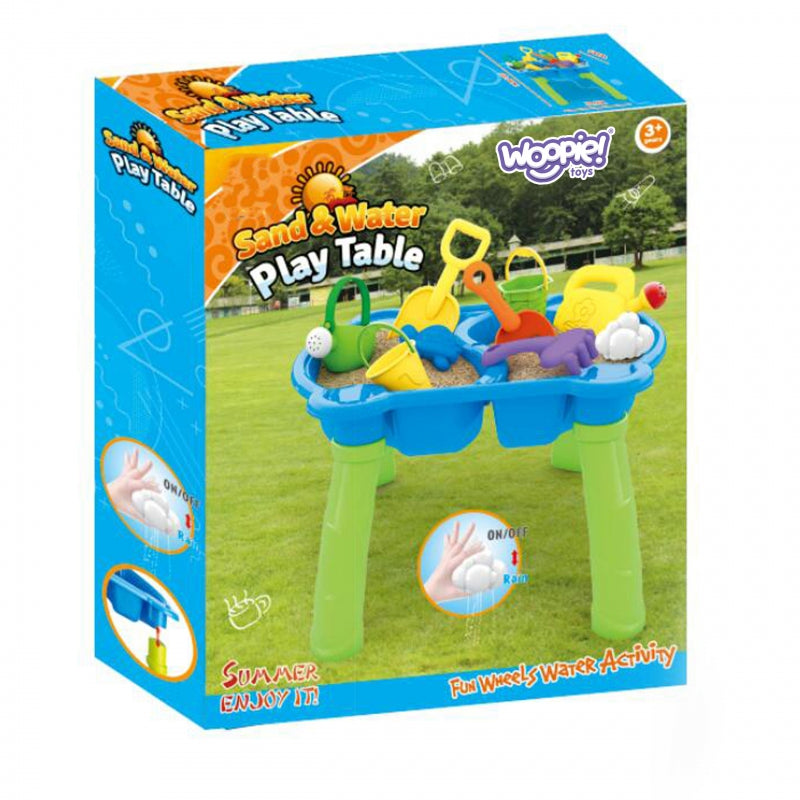 Prekės ženklo WOOPIE vandens smėlio stalas yra puikus žaislas su vandeniu ir smėliu. Stalas padalytas į dvi dalis, į vieną galima pilti vandenį, o į kitą - smėlį. Rinkinys skirtas žaisti tiek viduje, tiek lauke. Idealiai tinka žaisti patalpose ir paplūdimyje ar smėlio dėžėje.