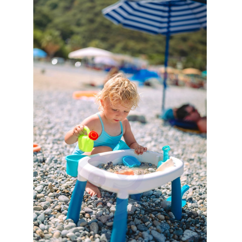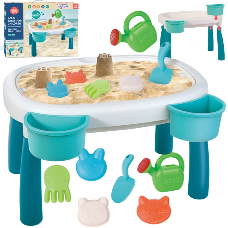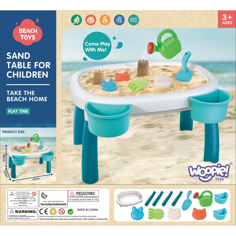 Prekės ženklo WOOPIE smėlio stalas idealiai tinka žaidimams su smėliu. Rinkinys skirtas žaisti patalpose ir paplūdimyje arba smėlio dėžėje.