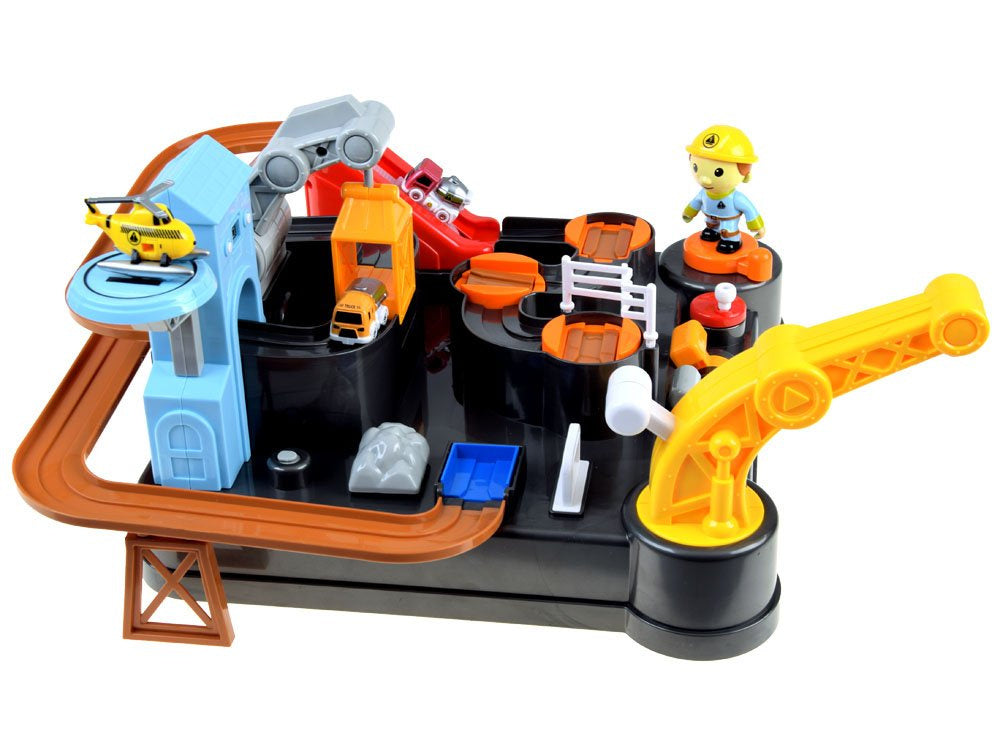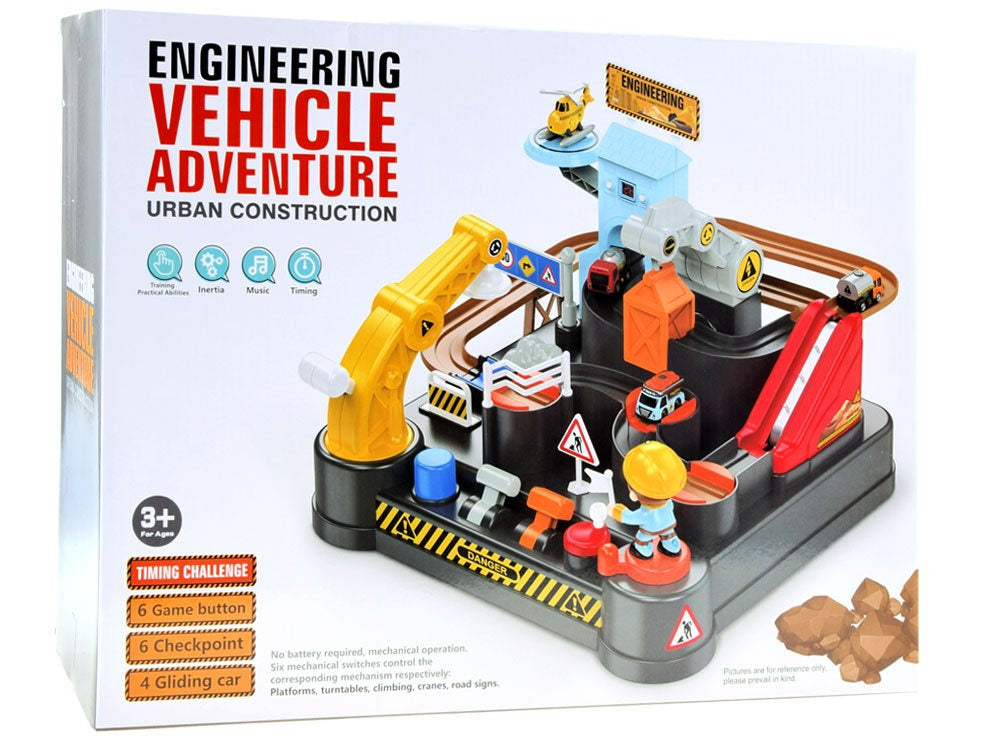Rinkinys mėgstantiems statybines transporto priemones. Rinkinį sudaro kliūčių ruožas, kurį mūsų mažylis gali saugiai nuvesti nuo pakrovimo maršruto iki visų statybinių transporto priemonių iškrovimo. Trasoje įrengti trys statybiniai automobiliai, tokie kaip savivartis, betono maišyklė, vandens cisterna ir sraigtasparnis.