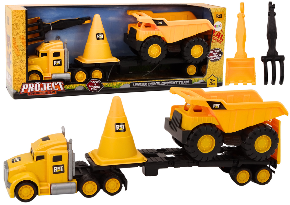 Šis statybinių žaislų rinkinys yra tikras lobis kiekvienam mažajam konstruktoriui! Rinkinį sudaro geltonas sunkvežimis su priekaba, savivartis, didelis geltonas kūgis ir kibiras su grėbliu, kurie suteiks valandų valandas nesibaigiančių linksmybių lauke ir viduje. Šis žaislų rinkinys ne tik lavina vaiko kūrybiškumą ir vaizduotę, bet ir moko pagrindinių konstravimo ir mechanikos sąvokų.