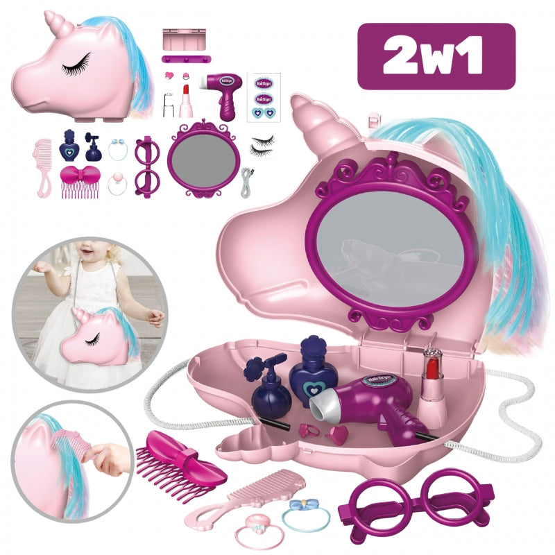 Didelis, laisvai stovintis baltas tualetinis staliukas ir aksesuarų rinkinys gražioje vienaragio rankinėje iš Viga – tai svajonių rinkinys kiekvienos mergaitės kambariui. Tualetinis staliukas turi ištraukiamą stalčių, kuriame jūsų mažoji princesė gali laikyti savo lobius. Po veidrodžiu yra skyrelių patogiems aksesuarams laikyti. Komplekte taip pat yra tualetinio staliuko kėdė. Vienaragio maiše yra visi reikalingi aksesuarai, kaip grožio salone.