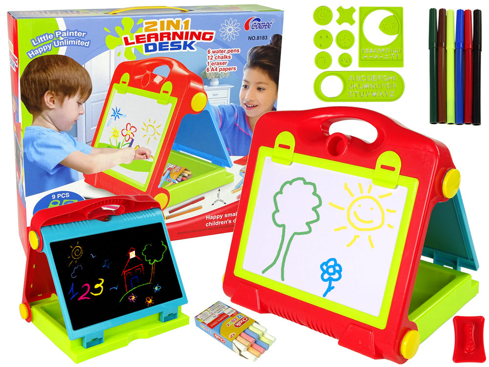 Galite pasirinkti tarp klasikinės mokyklos lentos ir modernios lentos ir vieną pusę dažyti pridėtu žymekliu, o kitą - viena iš 16 spalvotų kreidos dalių. Ir kai ateina laikas naujai lentos tapybai, tiesiog naudokite vieną iš dviejų kempinių.