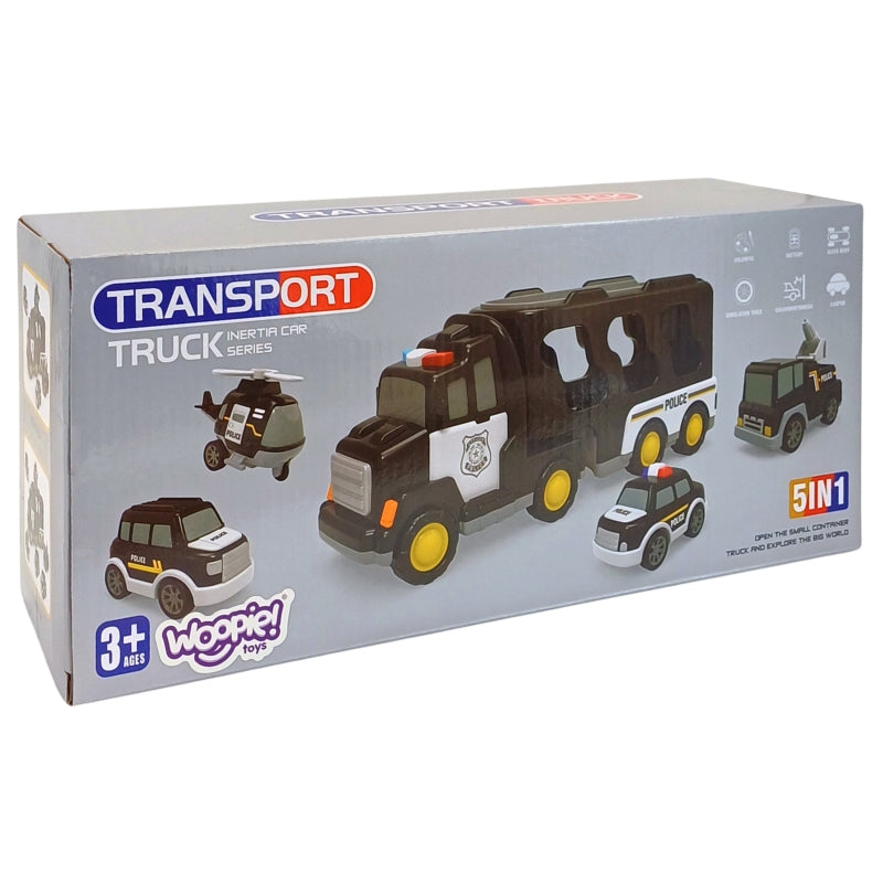 Didelis policijos sunkvežimio rinkinys + 4 automobiliai iš prekės ženklo Woopie Šis žaislas „5 viename“, sukurtas atsižvelgiant į mažuosius entuziastus, yra puikus rinkinys kiekvienam mažajam gelbėtojui! Paspauskite sunkvežimio kabinos viršuje esantį mygtuką, kad pamatytumėte ryškias mirksinčias šviesas ir išgirstumėte tikroviškas sirenas, kurios labai patinka vaikams. Kiekviena transporto priemonė turi judančių dalių, kurios leis jūsų vaikui pasijusti tikru didvyriu per gelbėjimo operacijas! Rinkinys yra puiki dovanos idėja gimtadienio, Kalėdų ar kitomis progomis.