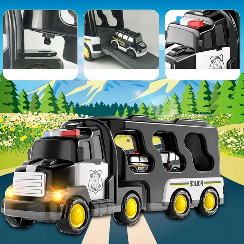 Sunkvežimio ir 4 automobilių rinkinys su garso ir šviesos efektais, policija, Woopie