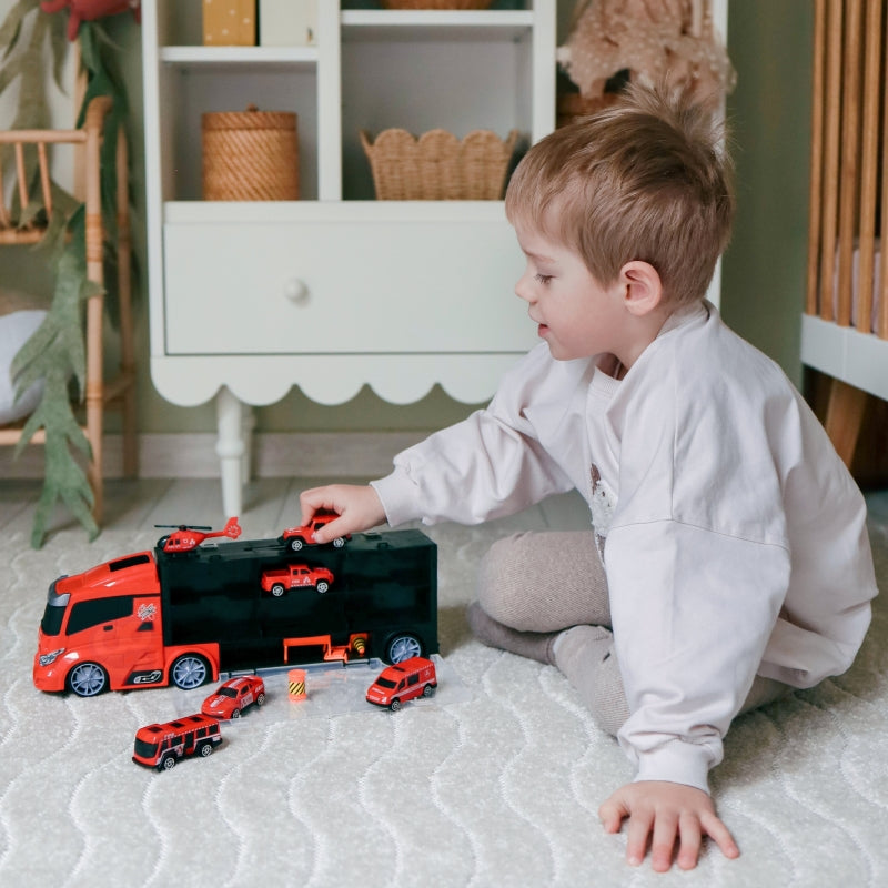 Prekės ženklo WOOPIE sunkvežimio ir automobilių rinkinys 3 in 1, tai puikus žaislas visiems mažiesiems transporto priemonių ir veiksmo gerbėjams! Dėl priekaboje esančio paleidimo įtaiso vaikai gali išplėsti automobilius ir paleisti juos įvairiais atstumais. Priekaba yra iki 40 cm ilgio, todėl yra pakankamai didelė, kad joje tilptų visos transporto priemonės ir priedai.